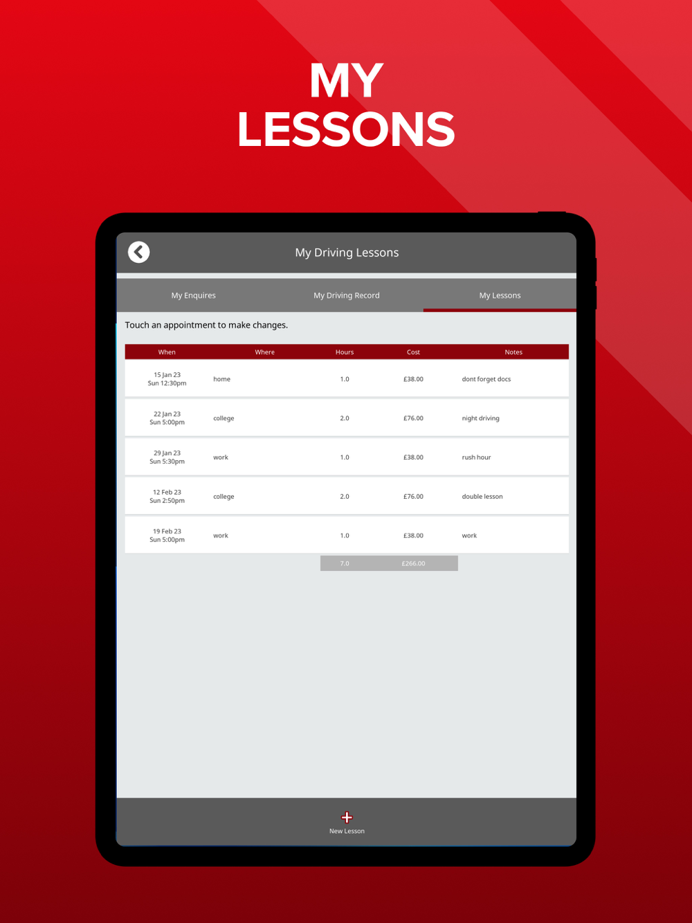 - Keep a track of your driving lessons...add your lessons, times, dates, pick up point and lesson costs