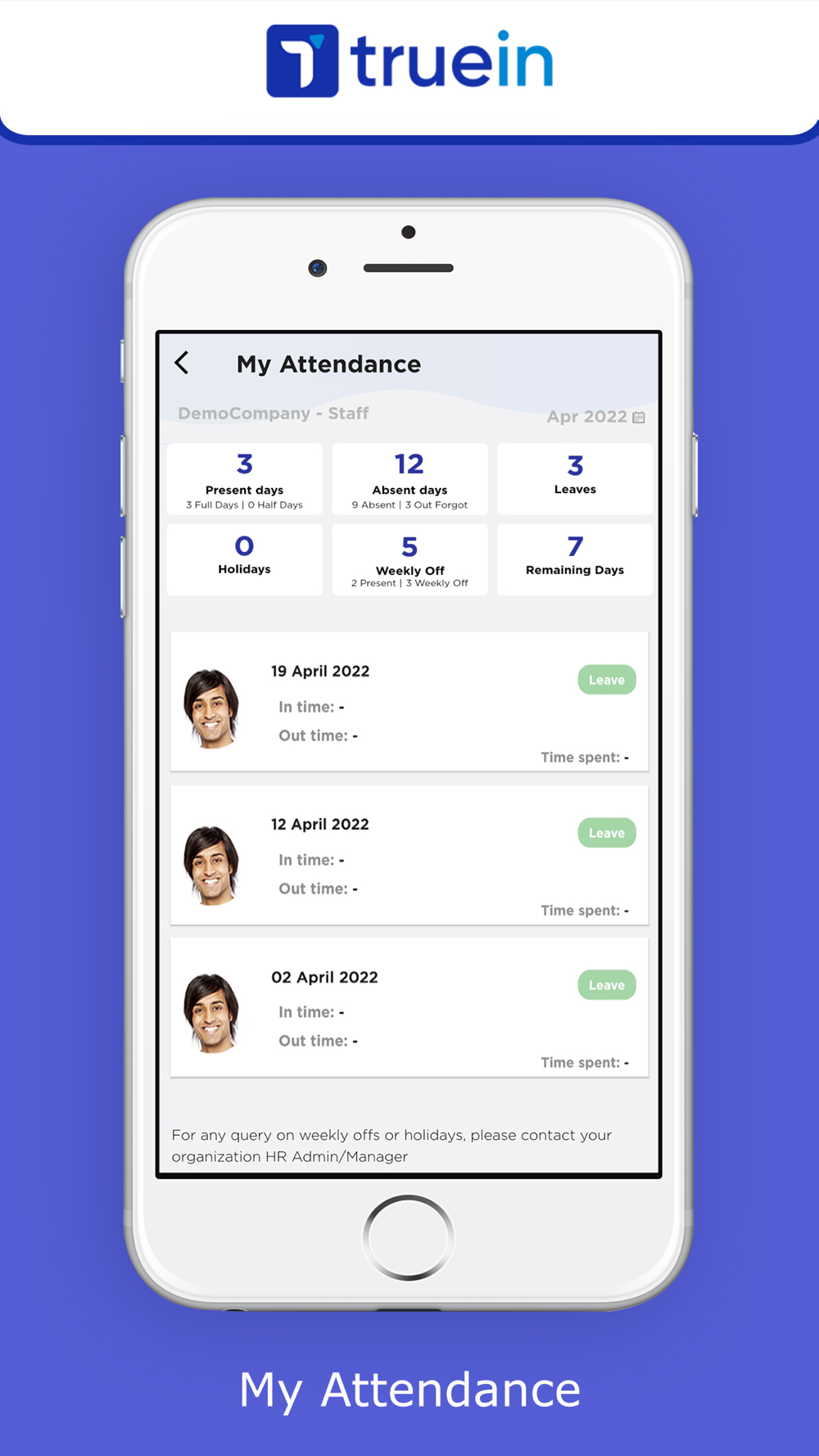 Truein is a Face recognition based Time and Attendance solution designed specifically for Contractual and Distributed workforce. It runs on any tablet/mobile and comes with a strong policy engine to automate your payroll calculations.