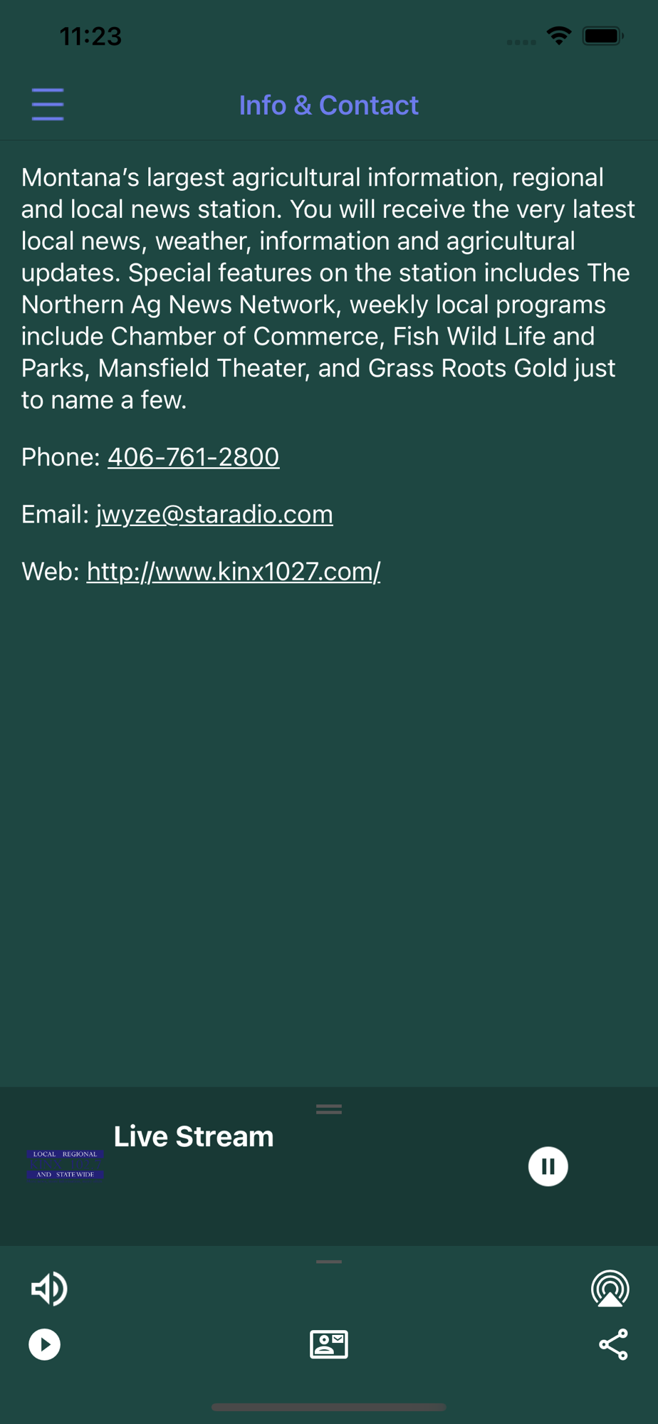 This is Montana's 100,000 watt, FM, regional AG and information radio station. A STARadio station, 406-452-1073.