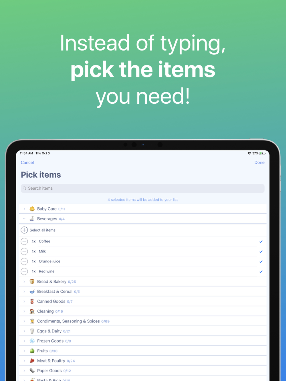 From our Shopping Template you can pick items from these categories: Baby Care, Beverages, Breakfast, Cleaning, Condiments, Eggs & Dairy, Frozen, Fruits, Meat, Poultry, Pet Items, Toiletries, Vegetables and many more!