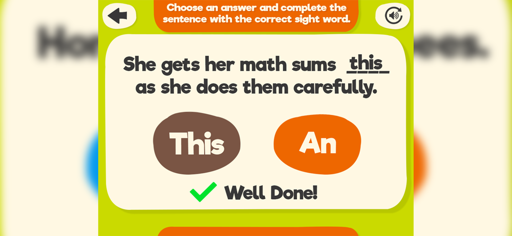 So we have provided exercises for sight words in which user has to fill in the right sight word to complete the sentence, in 2nd exercise, a user has to listen to sight word and type it from the given letters.