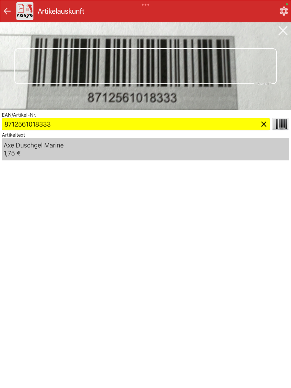 • Modul Artikelauskunft: Das Modul Artikelauskunft (sowie "Inventur") ermöglicht es Ihnen, einen Barcode zu scannen, woraufhin Ihnen die vor hinterlegten Stammdaten des gescannten Artikels angezeigt werden.