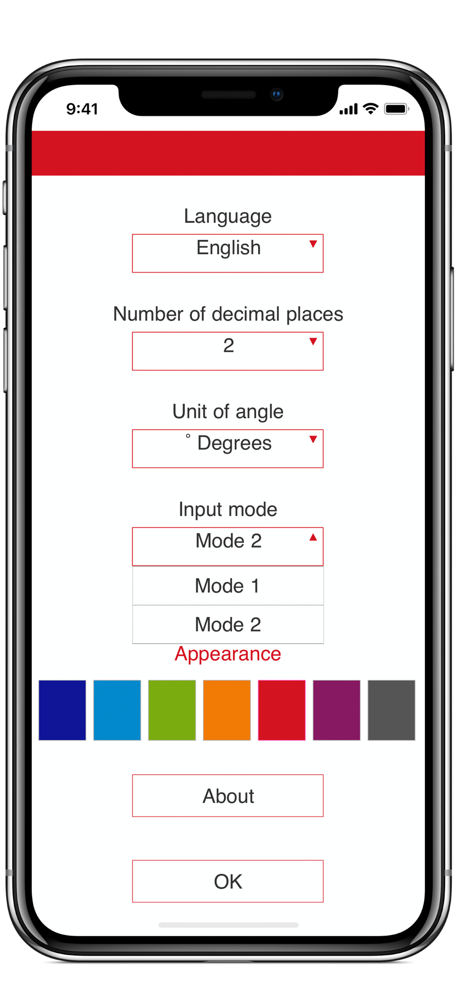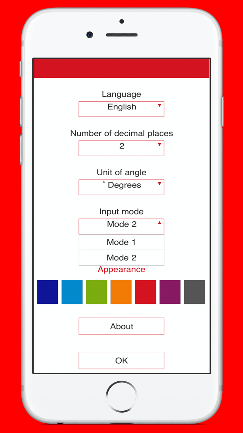 • Mode 2 (more visualized mode) - input fields for sides and angles are located directly on the triangle picture so you can easily understand which parameter you are entering.