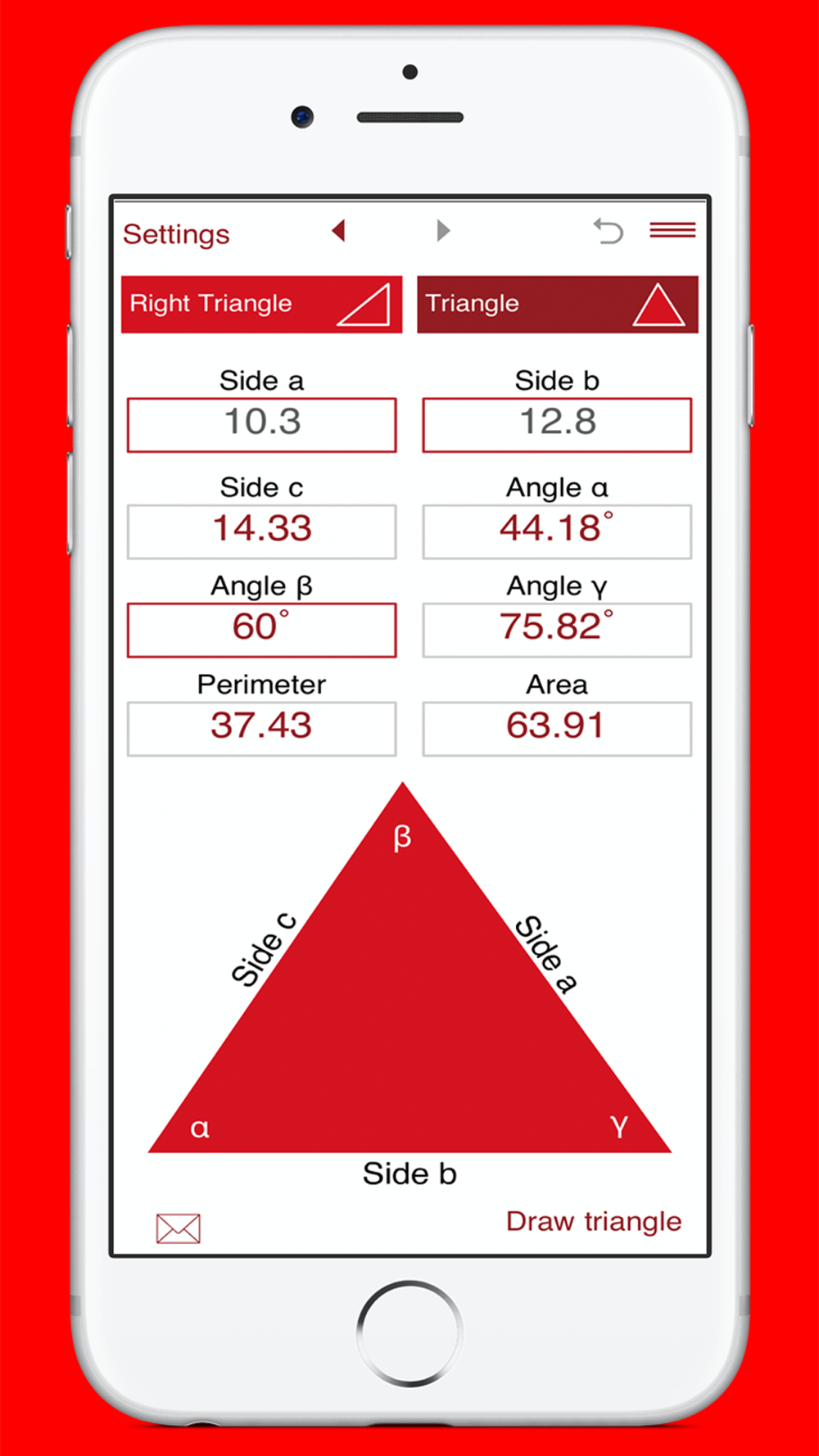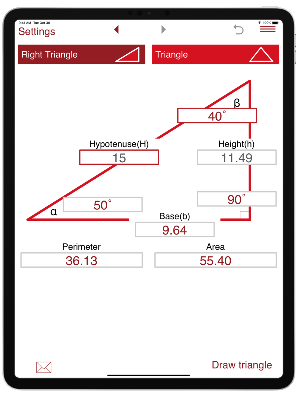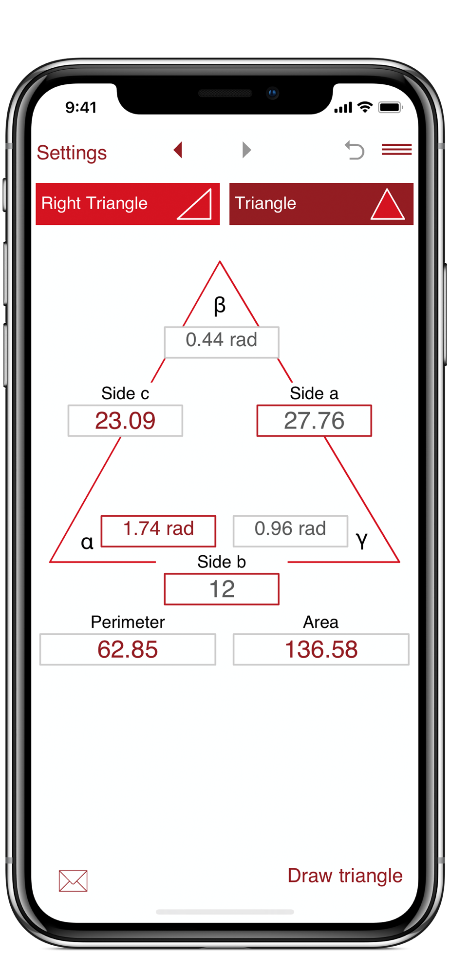 Trigonometry Master is a easy to use app that allows you to quickly calculate unknown sides and angles of any triangle. It will also calculate the area and perimeter and draw the triangle.
