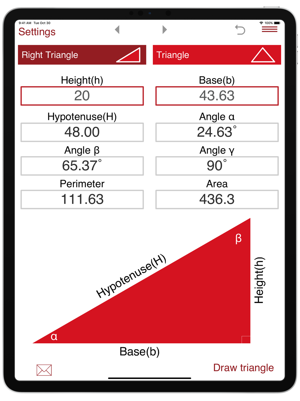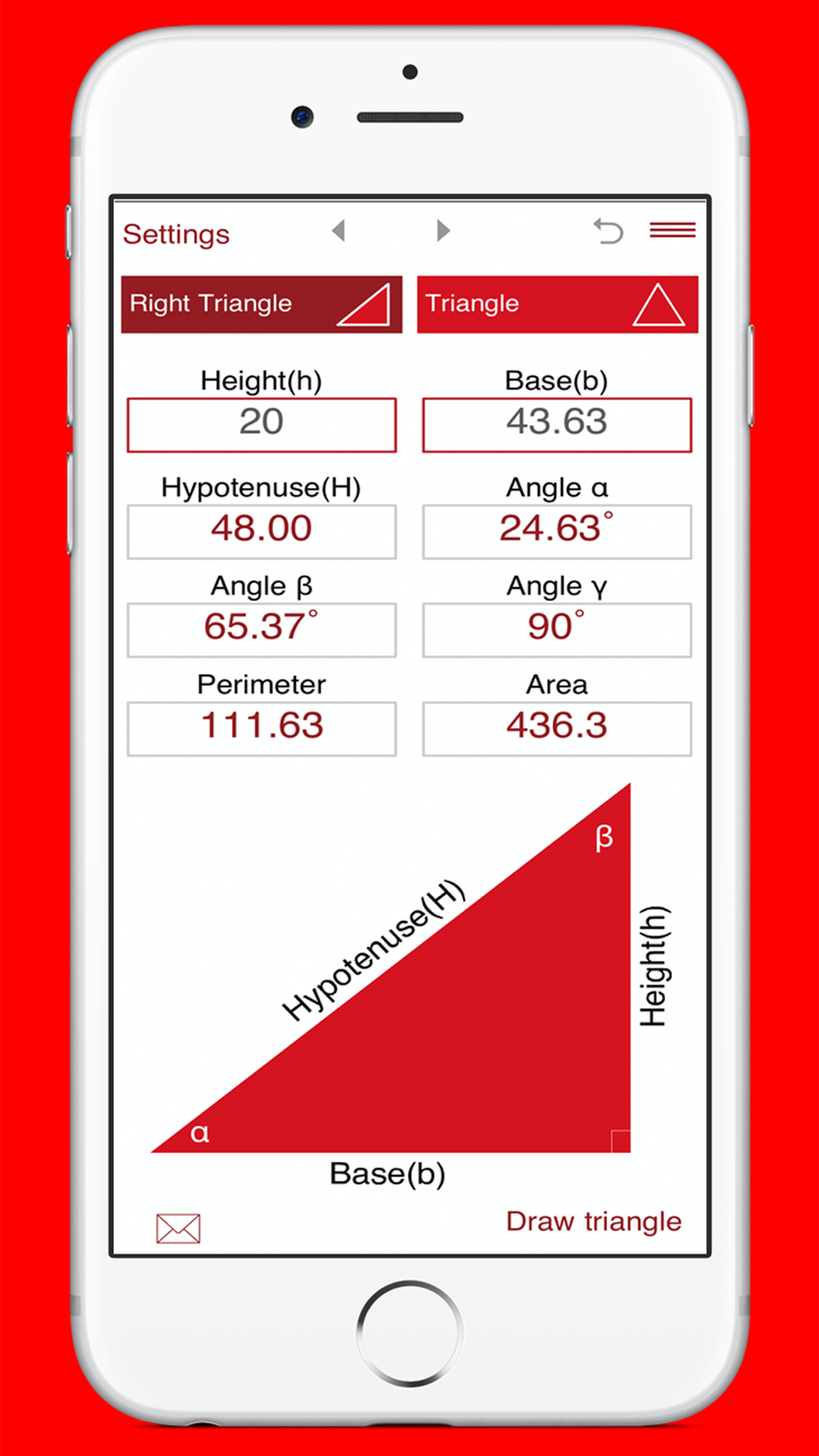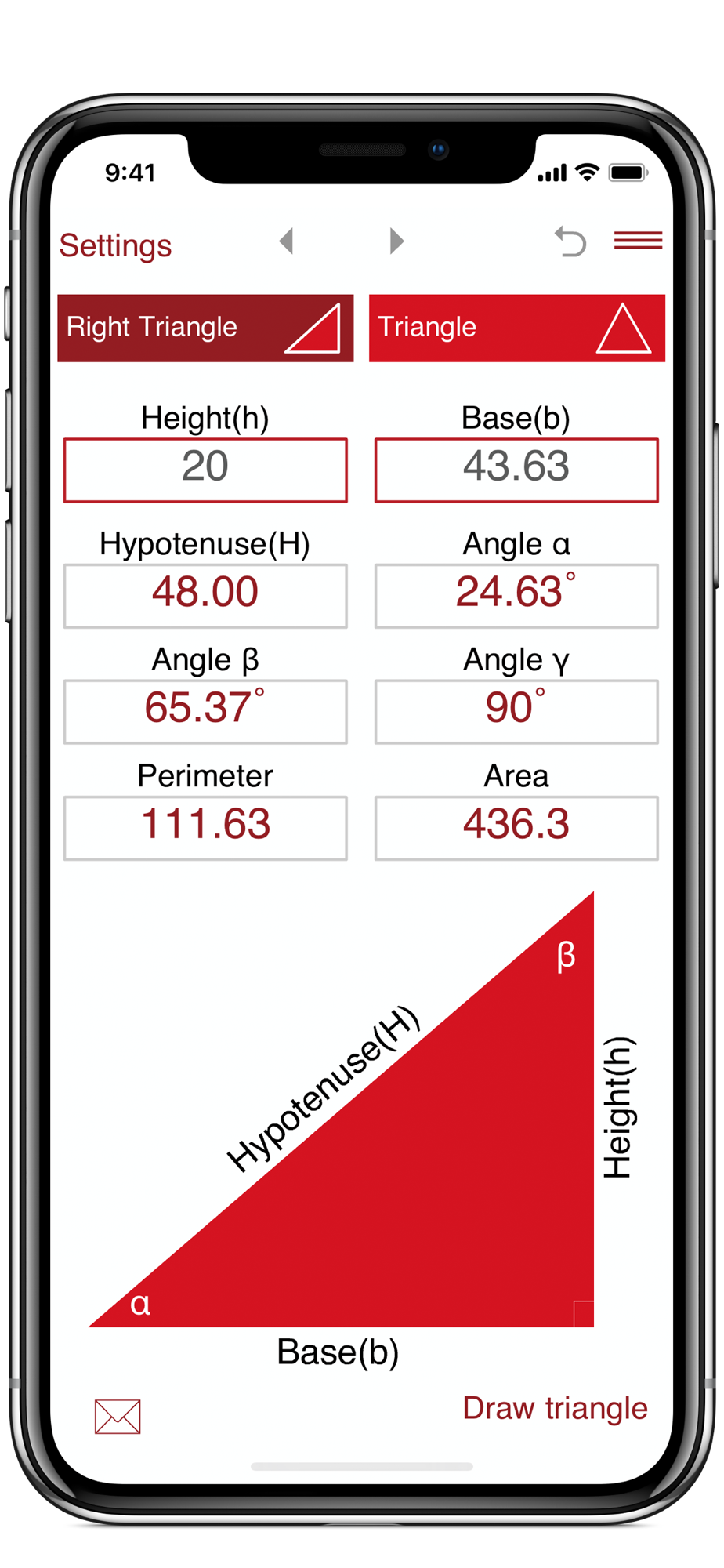 Trigonometry Master is a easy to use app that allows you to quickly calculate unknown sides and angles of any triangle. It will also calculate the area and perimeter and draw the triangle.
