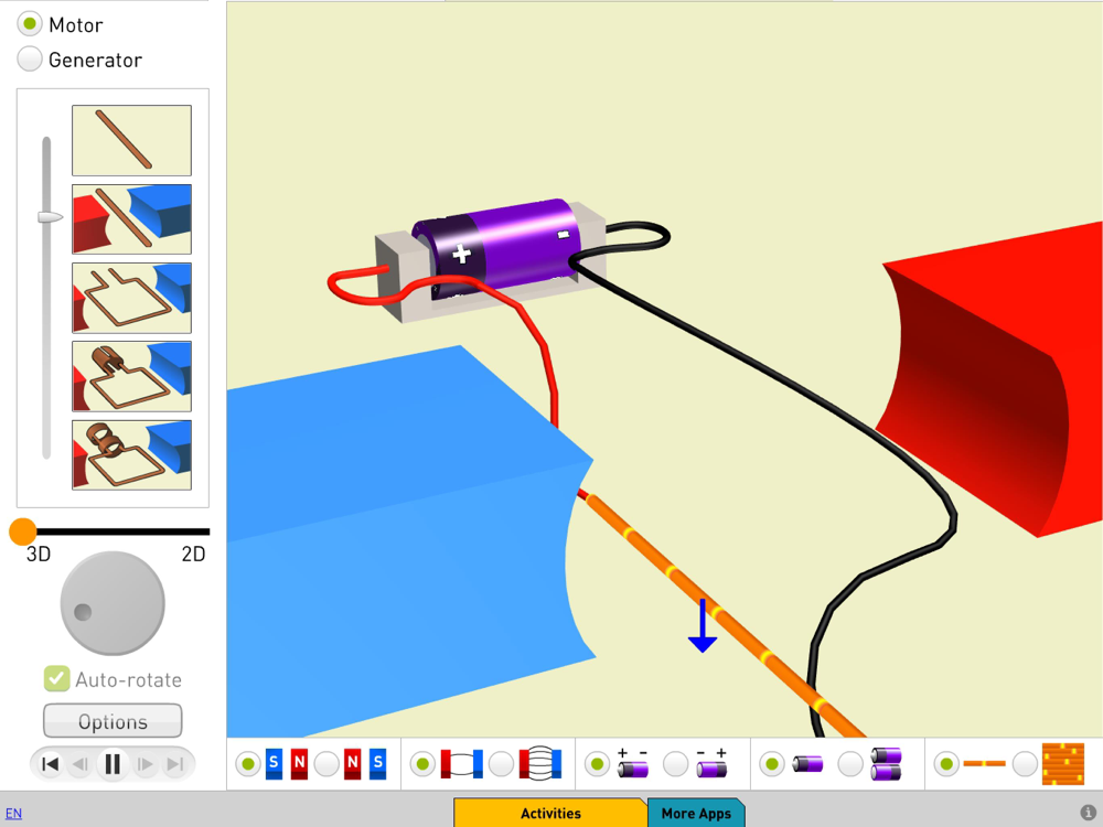 Motors and Generators lets you build a motor or generator in stages - either as a 3D model or in 2D showing animated field lines. You’ll use it to cover: