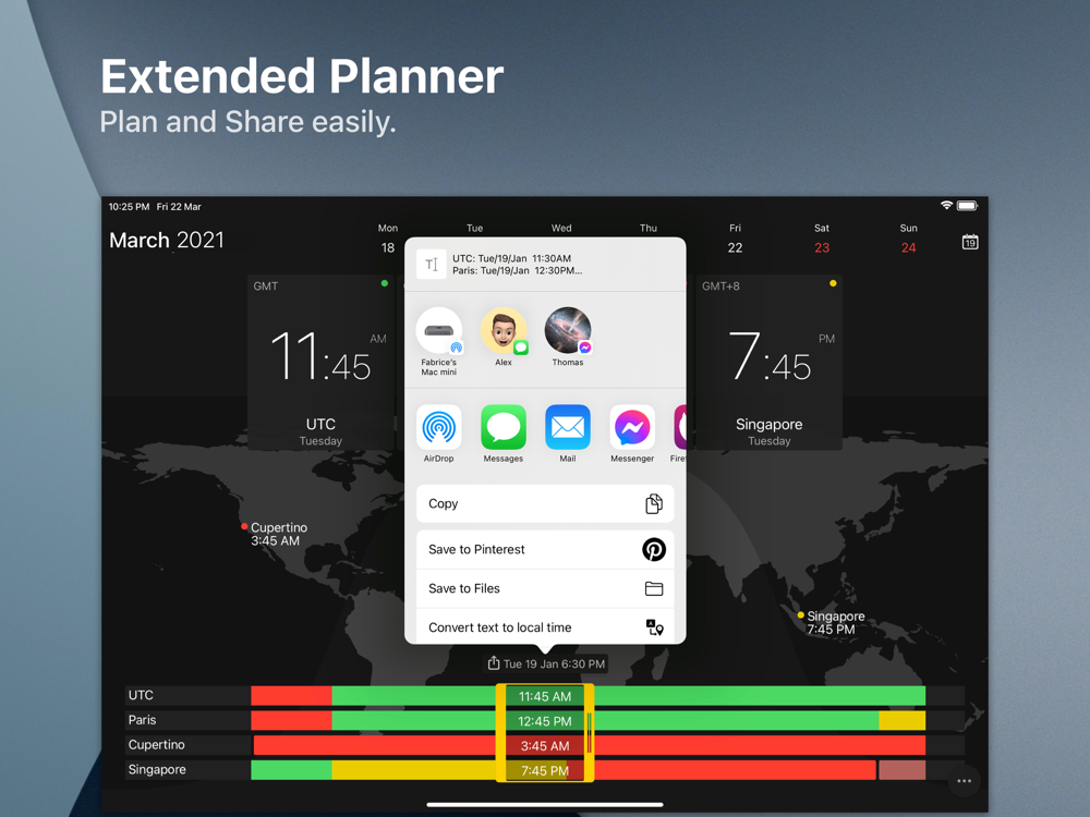 • Keep track, easily and efficiently of your contacts in different time zones.