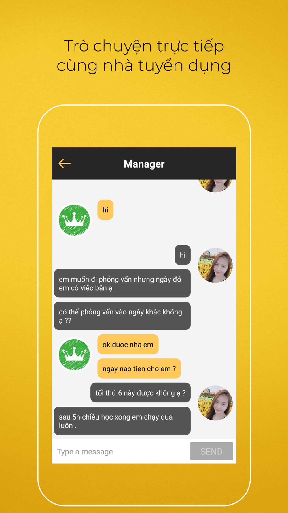 Nhắn tin trực tiếp miễn phí với nhà tuyển dụng đã mời bạn phỏng vấn nếu bạn có bất kỳ câu hỏi nào để hỏi.