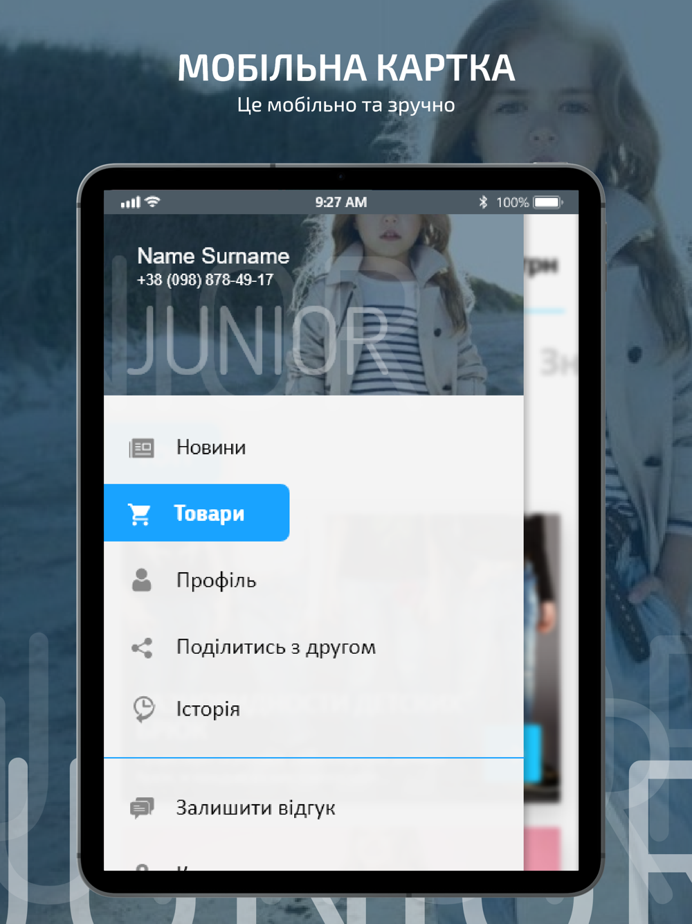 Програма лояльності для клієнтів "Юніор". Допомагає клієнтам накопичувати бонуси за покупки, а також спостерігати за останніми новинками, купувати сертифікати та ділитись ними з друзями, стежити за товарним асортиментом.