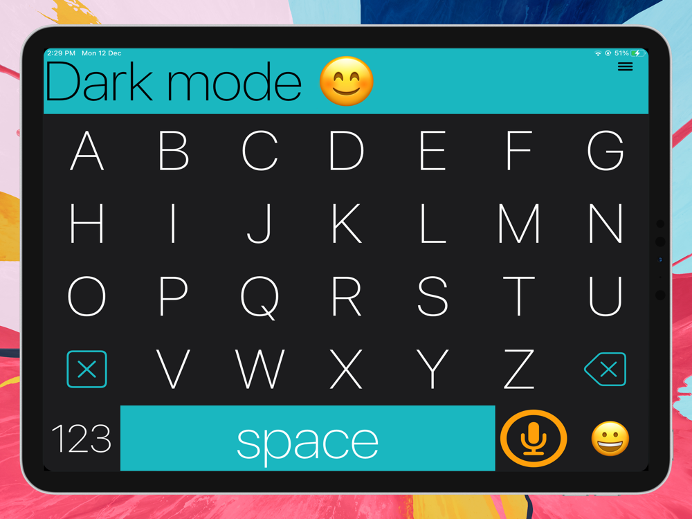 There are 3 easily accessible keyboards containing the alphabet, numbers and emoji's. The keyboards have been maximised to make it easier to hit the correct keys.