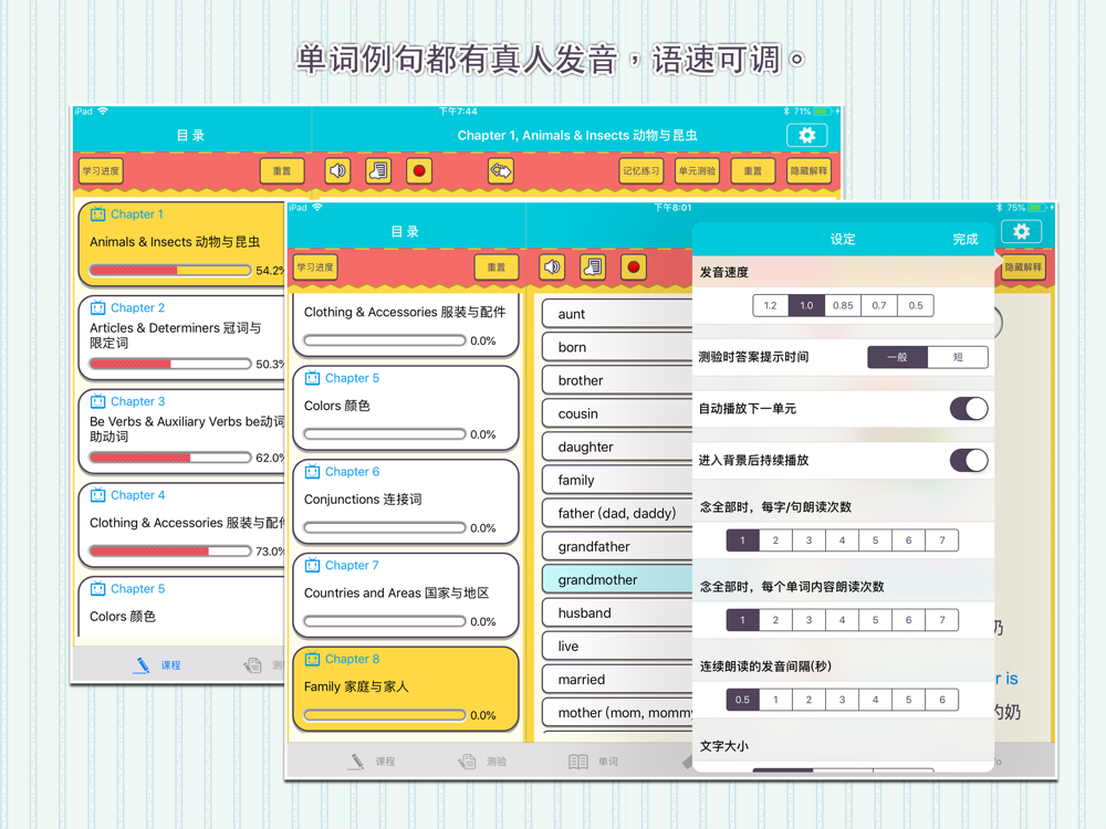 * 每个单词和例句等都有专业美籍播音员真人发音。