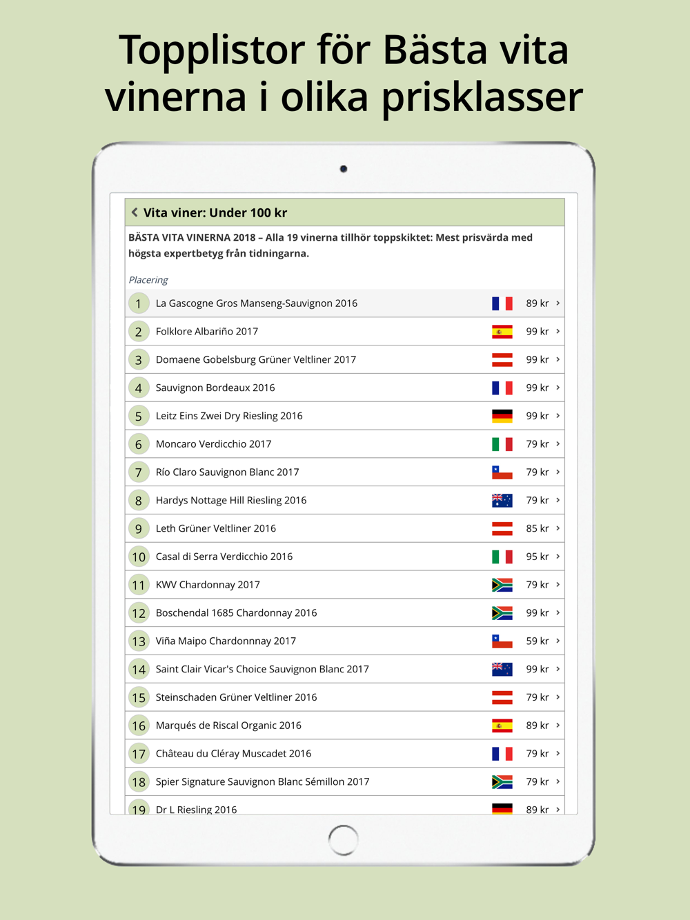 * 18 topplistor med expertbetyg: Röda och Vita viner, Rosé, Champagne, Prosecco och andra mousserande viner.