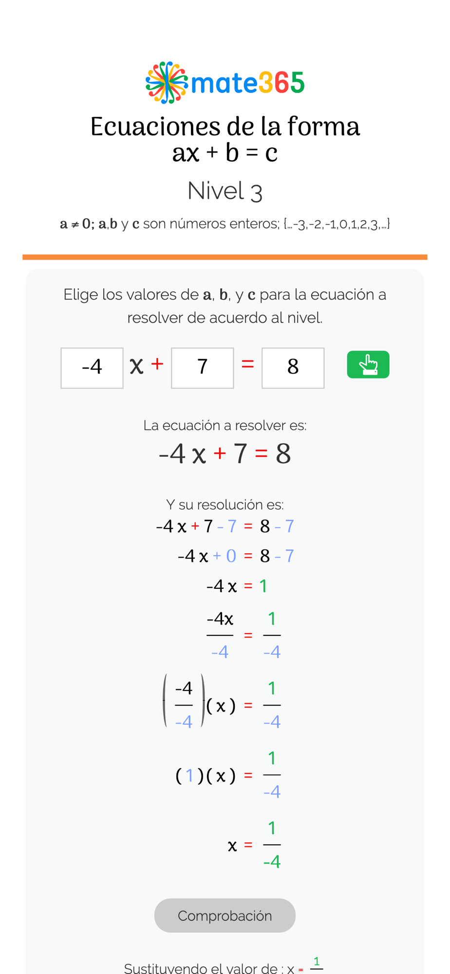 Mate365 presenta la aplicación para resolver ecuaciones de la forma: ax+b = c utilizando propiedades de los números, tales como el inverso aditivo, el inverso multiplicativo, agrupación y reducción de términos semejantes, etc, con la finalidad de despejar y obtener el valor correcto de la incógnita X.La resolución de ecuaciones de primer grado del tipo de ecuación referida, es básica para resolver otras ecuaciones lineales más complejas.