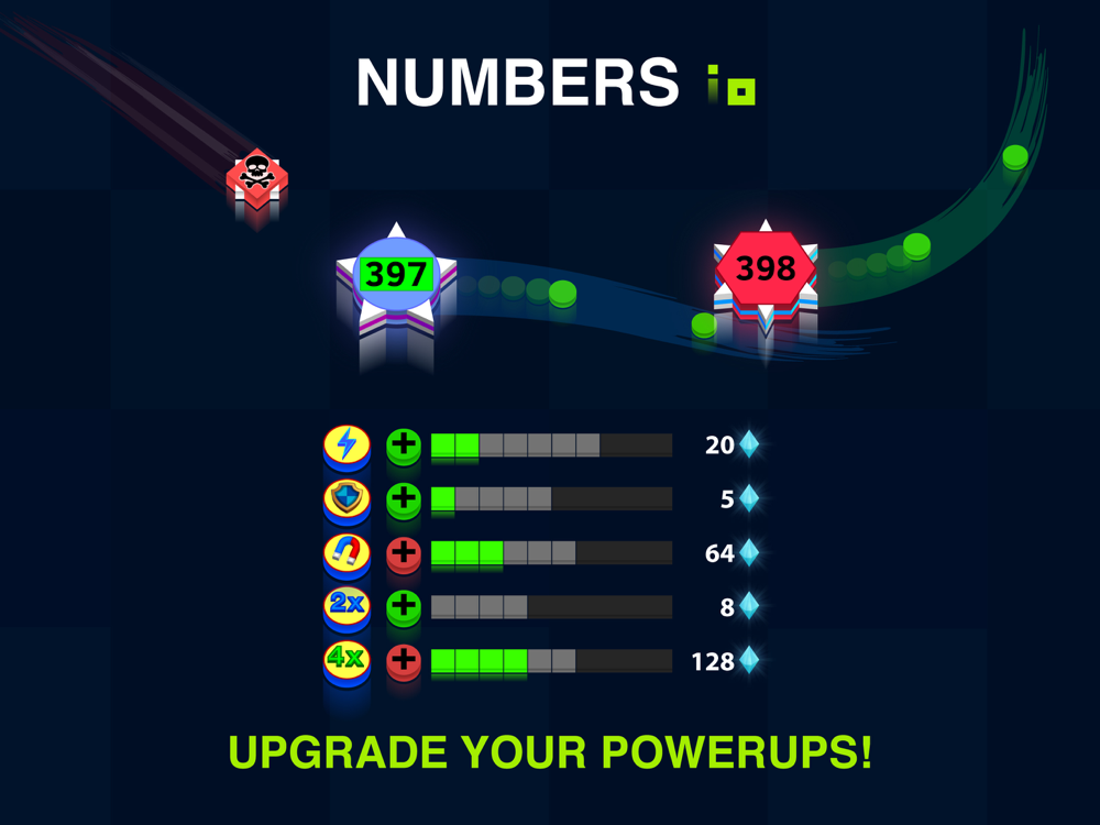 New addictive io game. Compete with players around the world. Unlock new characters! Kill smaller numbers to grow! Avoid bigger numbers! Upgrade your power ups! Collect green dots to increase your number. Use boost to speed up! Run away from red obstacles!