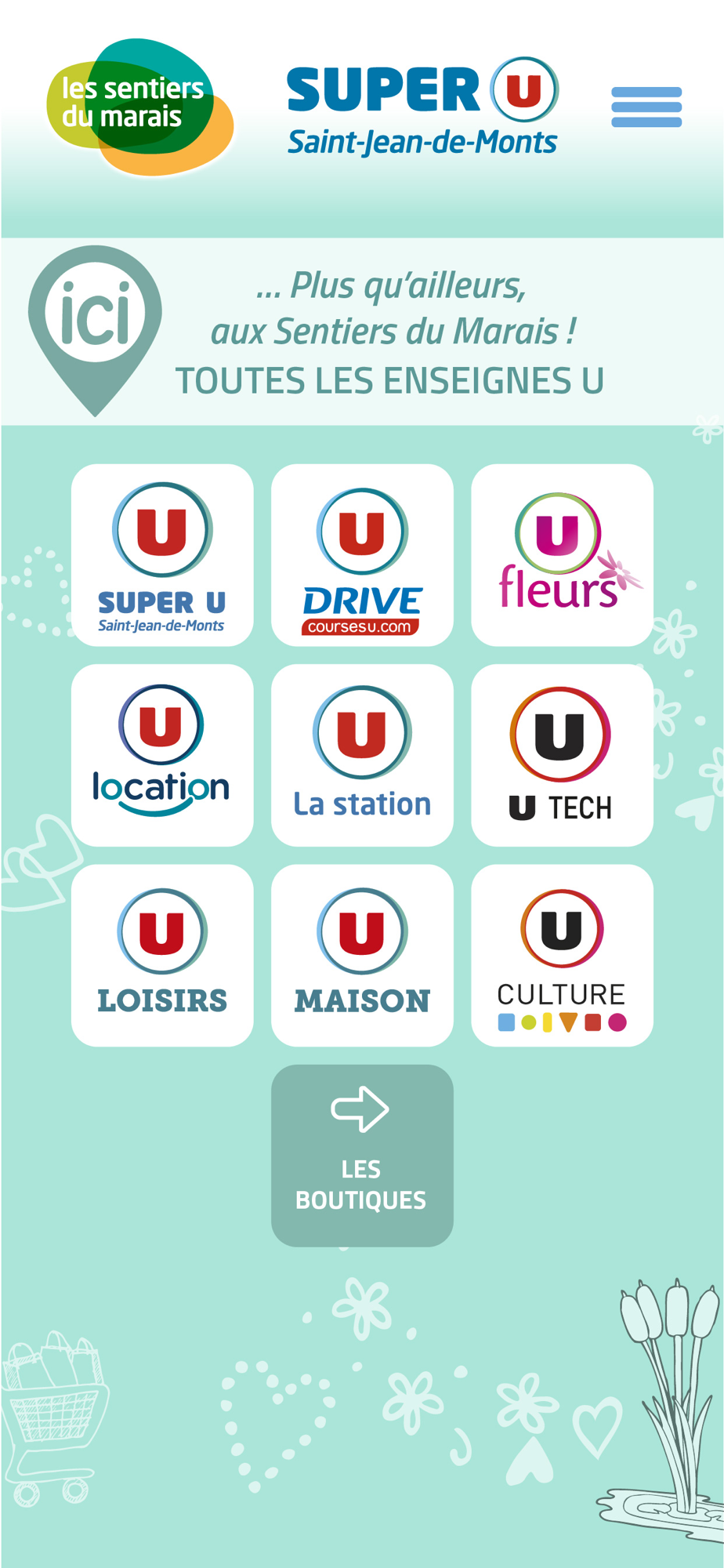 Elle vous donne l’affluence en magasin, le nombre de places disponibles en temps réel sur le parking de Super U Saint-Jean-de-Monts, et désormais 4 plans, avec l’électrique, la parcours vélo et la localisation des enseignes.