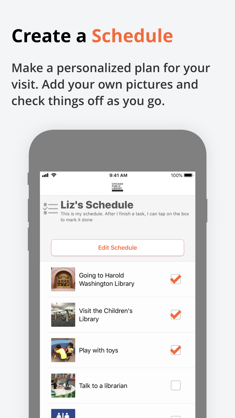 Design an inclusive and personalized visit to the Thomas Hughes Children's Library! A sensory friendly map and customizable schedule help to prepare you for your visit. Tips, social guides, communication visuals and a timer help create a fun visit for all patrons.