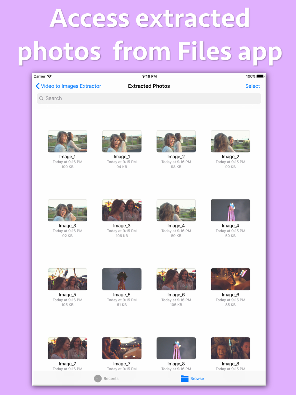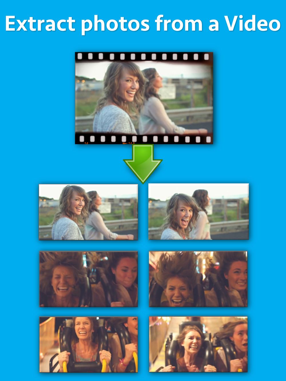 The application extracts high quality photos from a Video. It is tightly integrated with the "Files" application. All extracted photos could be accessed easily using the "Files" application.