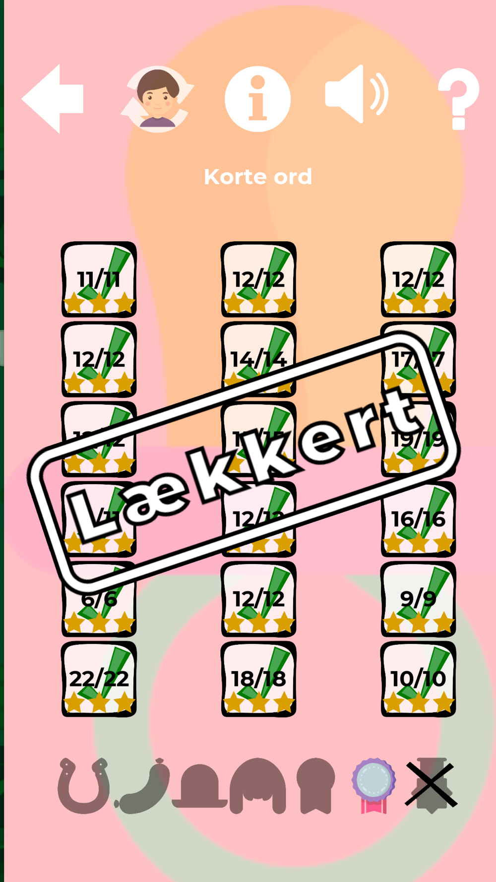 Er du lige ved at lære at stave, kan du få baner der kun mangler få bogstaver og baner med korte ord. Der er også en bane med de klassiske 120 ord fra dansklæreforeningen.