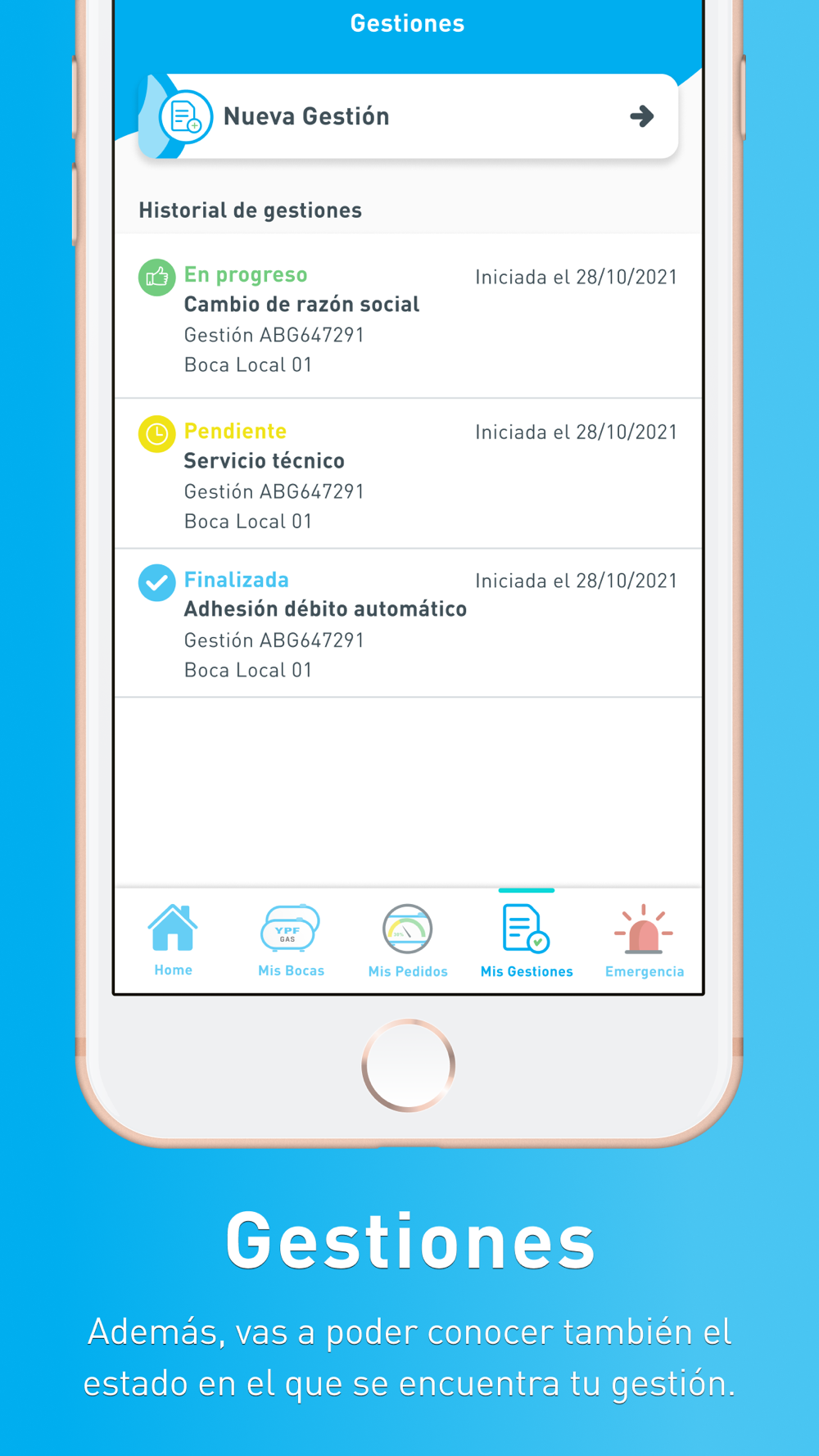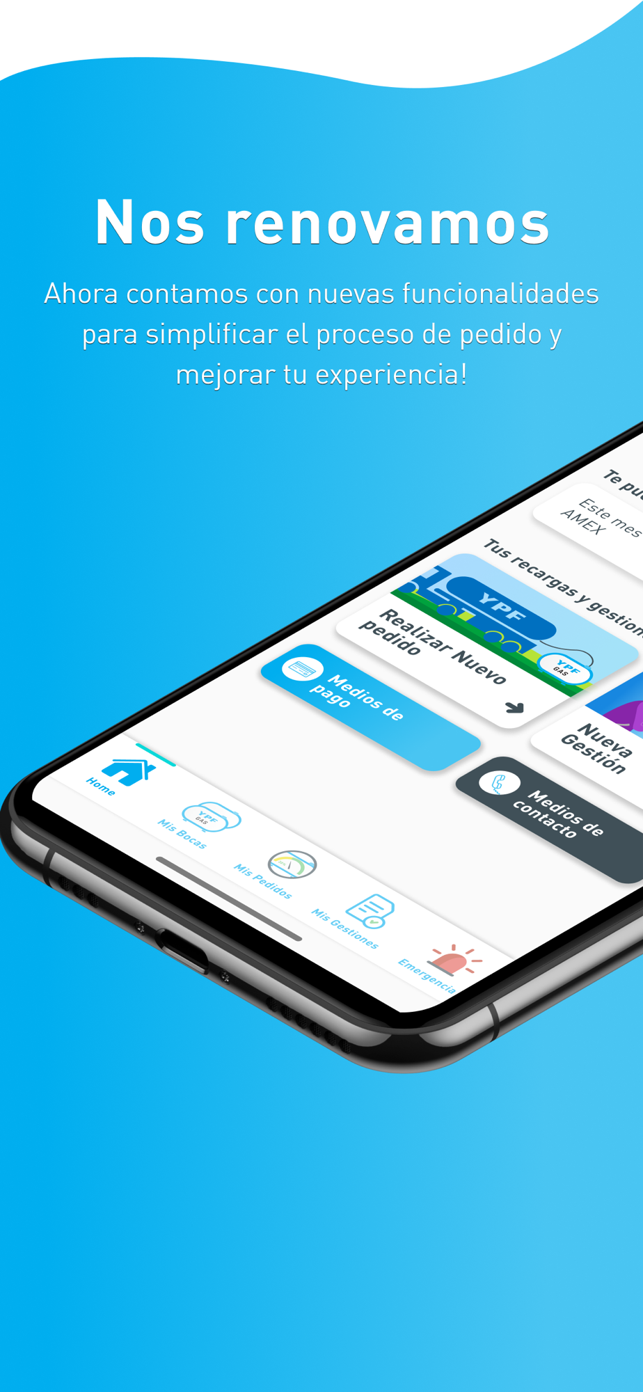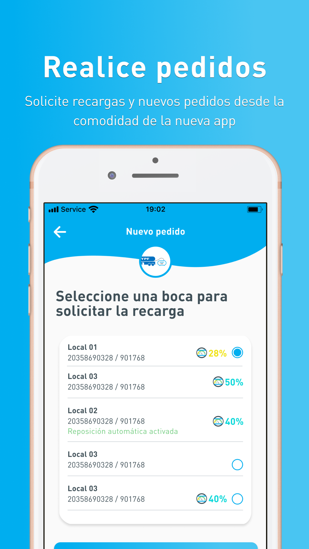 App exclusiva para clientes del servicio de GLP a granel de YPF GAS. Funcionalidades: registro de clientes, asociación a una o más bocas, gestión de pedidos, acceso a los canales telefónicos de contacto.