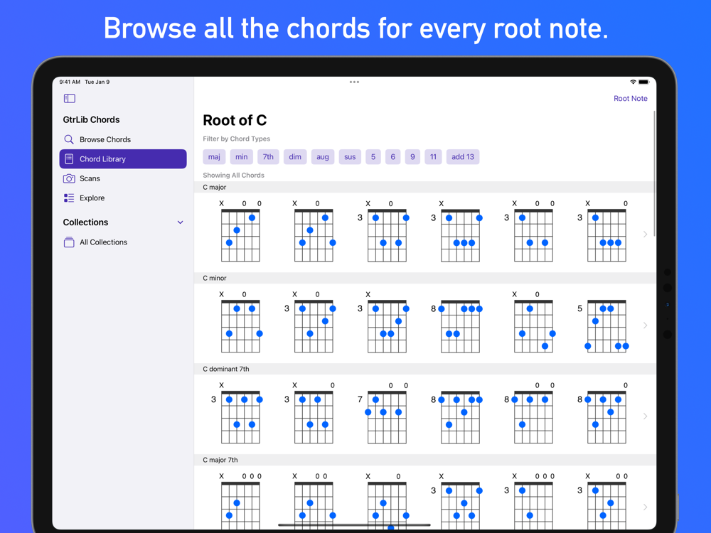 Explore the vast and comprehensive collection of guitar chords in GtrLib Chords Pro. Get all the possible positions of any chord throughout the fretboard along with its suggested fingering and audio demonstration. Use the built-in search to quickly get to any chord that you are looking for. GtrLib Chords is an invaluable tool in the pocket of any guitarist.