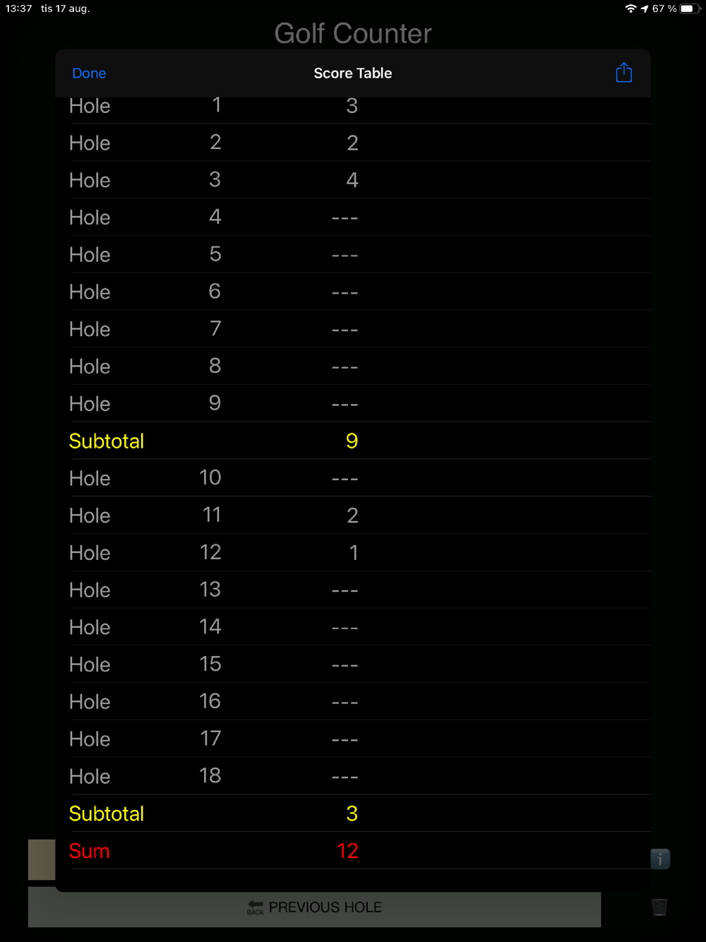 This simple golf hits counter app just does what it is named after. It counts (manually by you) all your hits on the golf course for each hole. All you need to make things even easier is a Apple iWatch and you can dump your iPhone in your pocket or even forget the phone at home.