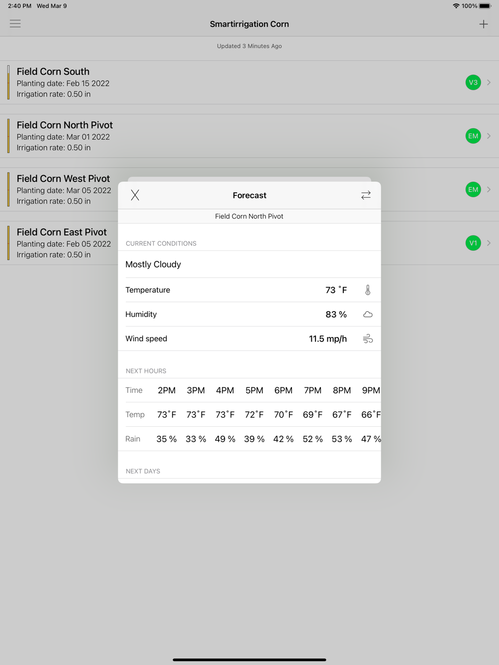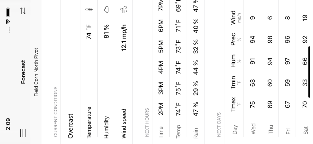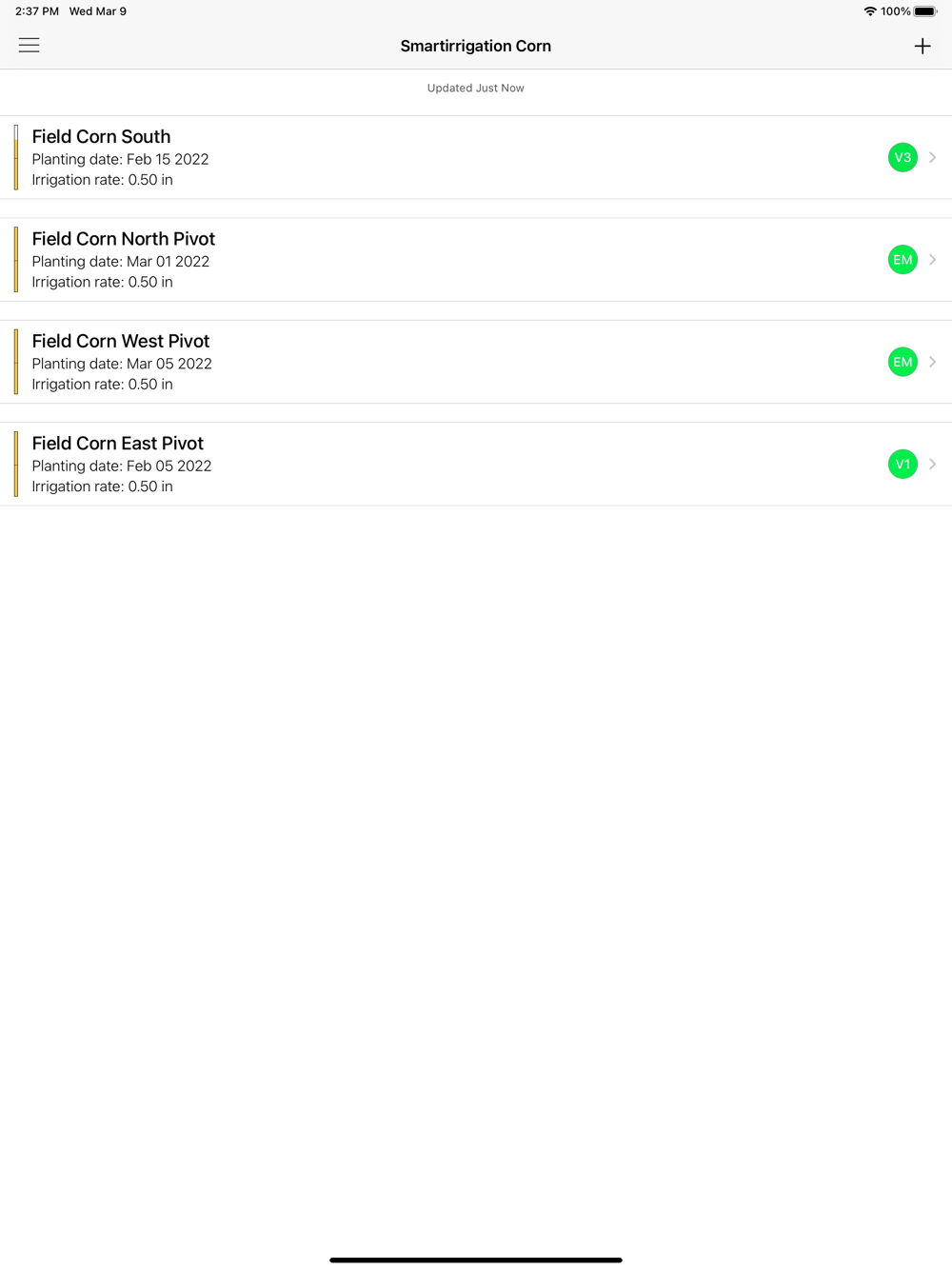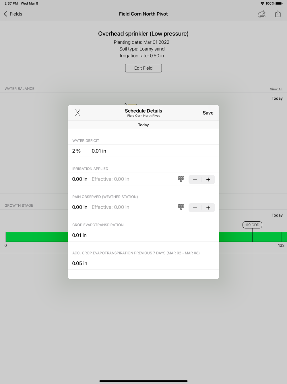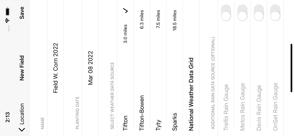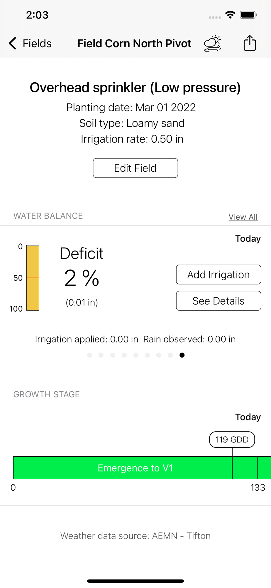 Users can register multiple fields. The app tracks available soil moisture in all registered fields and sends push notifications when irrigation is recommended or when the crop is approaching a new growth stage. Irrigation recommendations for Variable Rate Irrigation Systems can be achieved by registering each irrigation zone within a field as a different field.
