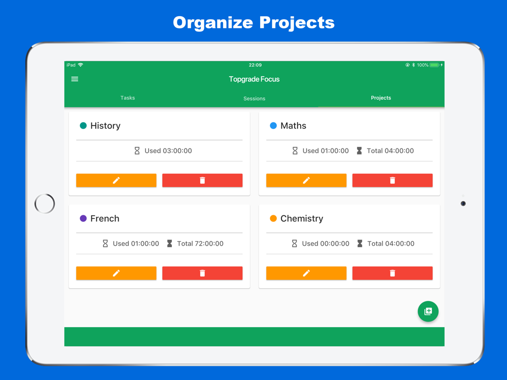 The app allows you to quickly add projects and tasks. You can then start working sessions with the tap of a button. How long you spend on each session is automatically logged in the app.