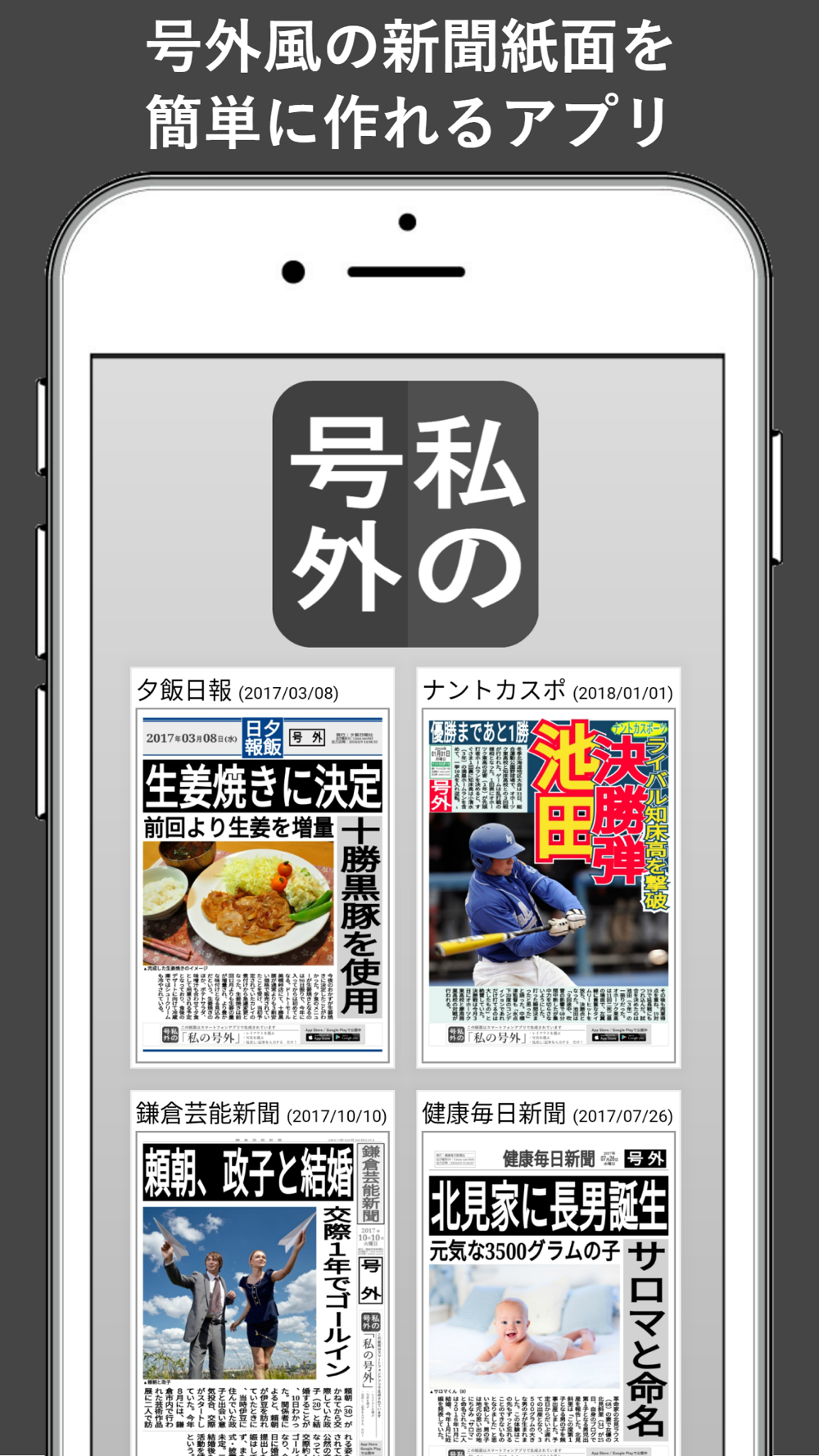 号外風の新聞を作るアプリです。自分だけの新聞を作成する新聞メーカー、新聞ジェネレーターです。