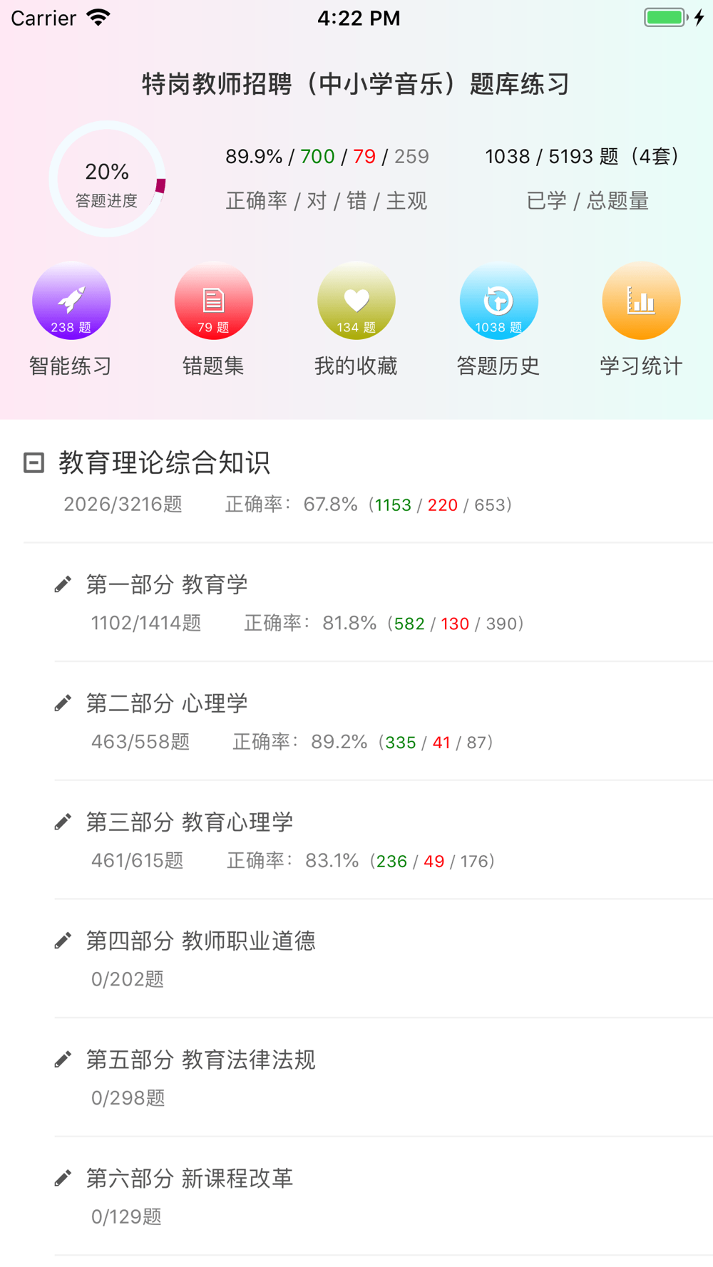 APP不仅内容是专项与全面,在答题体验上也是特别好。不仅有全局的答题进度、正确效、答对错统计、答题历史、学习统计,对于各个小部分都有相应的答题进度、答题统计等,同时用户可进行多种方式练习:比如,继续未答过的题、复习已答题、重做错误、查阅错题、复习我的收藏题等,做到多方位强化练习。是一款不可多得的特岗教师招聘考试题库APP。