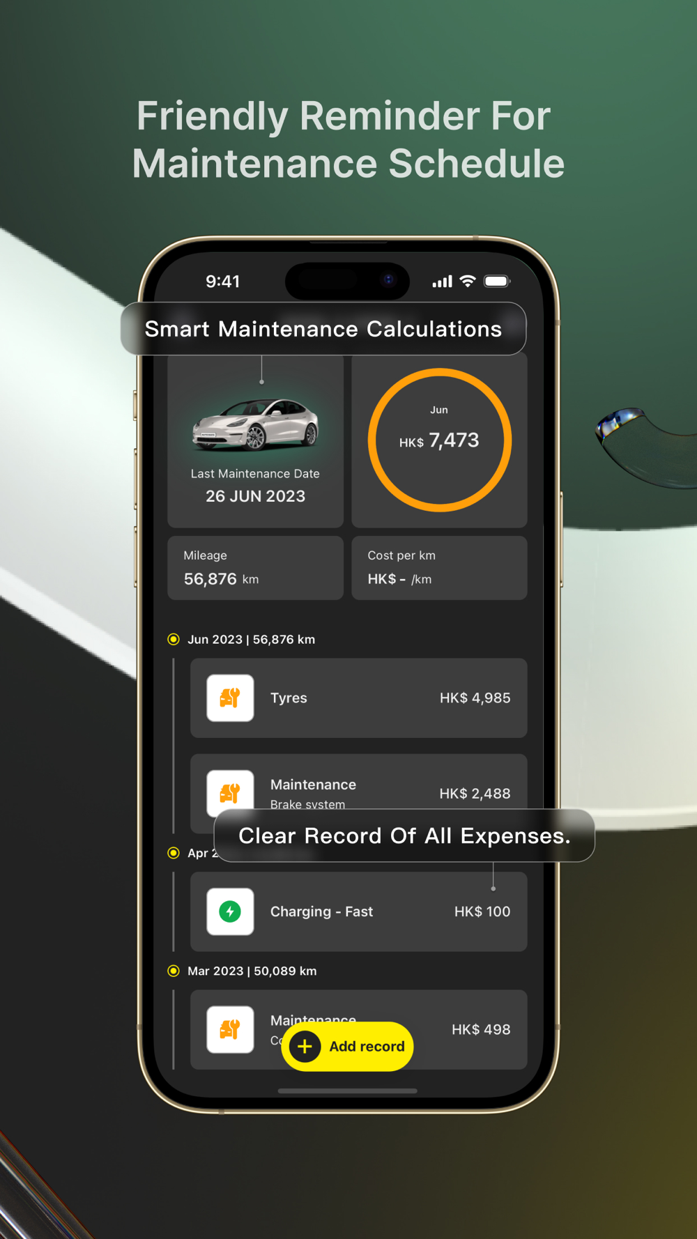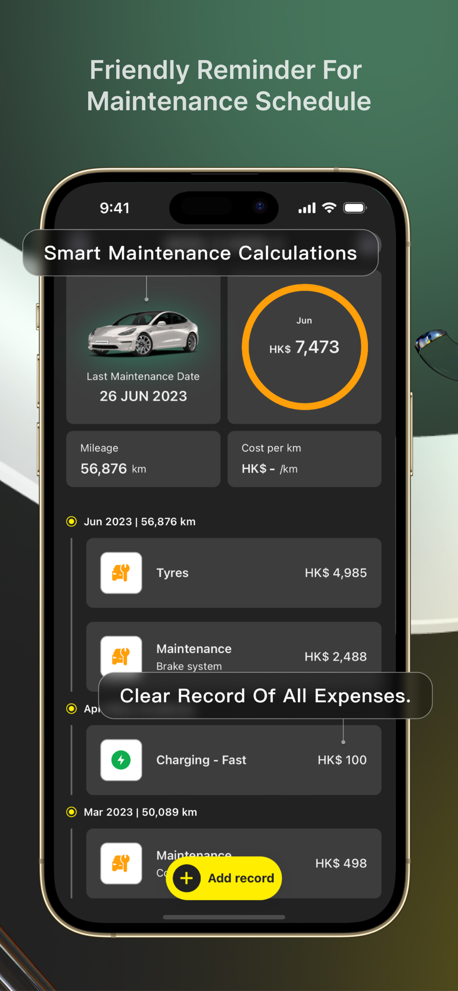 Record all supplies, expenses and services of your vehicle, including repairs, mileage, refuel, parking, license fee, etc.