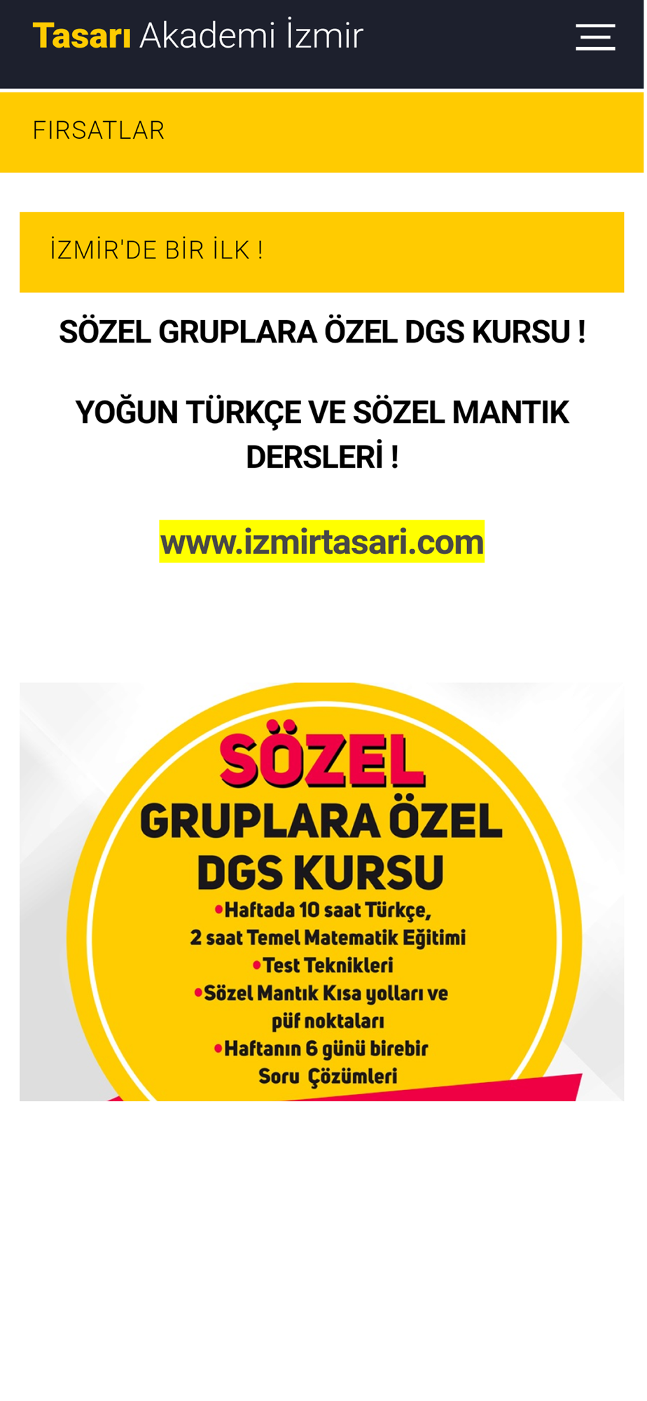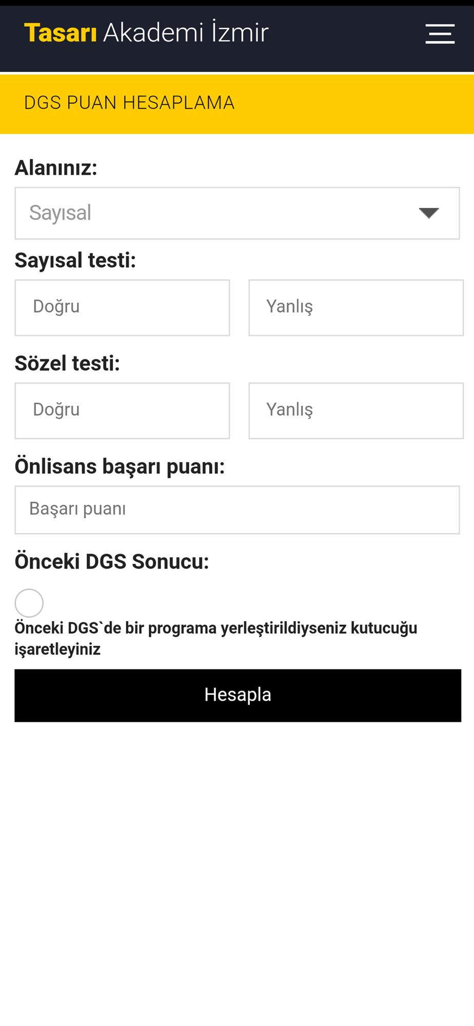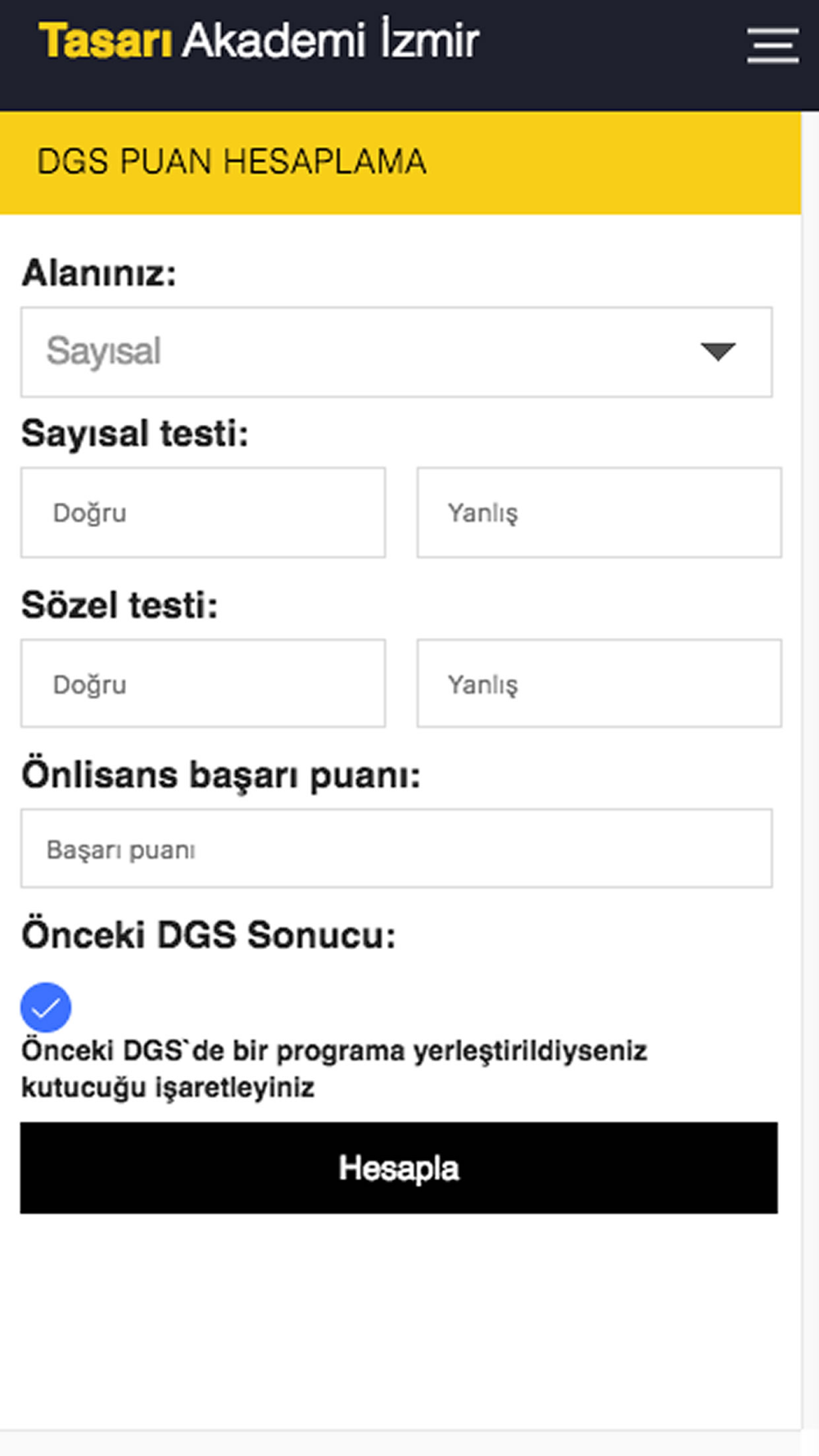 DGS Puan Hesaplama uygulaması içeriğinde alanınıza göre doğru ve yanlış soru adetlerini girerek puan hesaplayabilmenizi, sınava ne kadar süre kaldığını belirten takvimi, sınava hazırlık sürecinde 150 dakikalık geriye sayan bir sayacı içermektedir. Bu uygulama Tasarı Akademi İzmir şubesi tarafından kullanıma sunulmuştur.