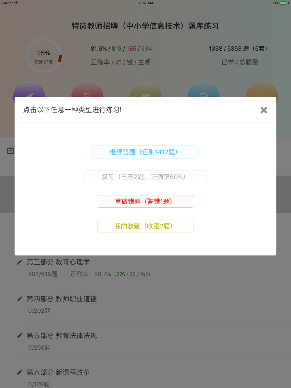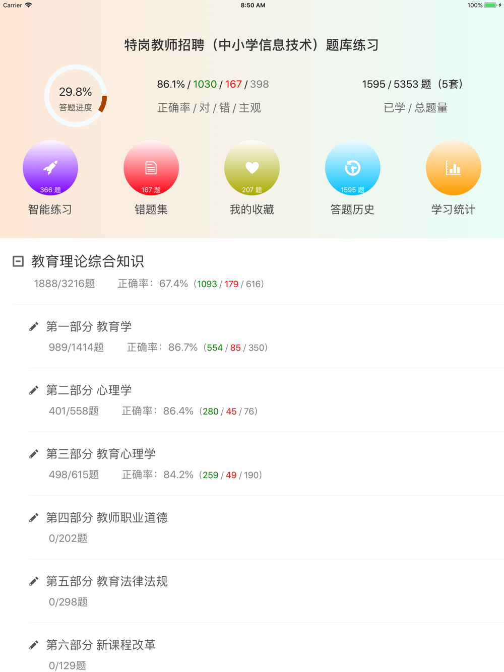 APP不仅内容是专项与全面,在答题体验上也是特别好。不仅有全局的答题进度、正确效、答对错统计、答题历史、学习统计,对于各个小部分都有相应的答题进度、答题统计等,同时用户可进行多种方式练习:比如,继续未答过的题、复习已答题、重做错误、查阅错题、复习我的收藏题等,做到多方位强化练习。是一款不可多得的特岗教师招聘考试题库APP。