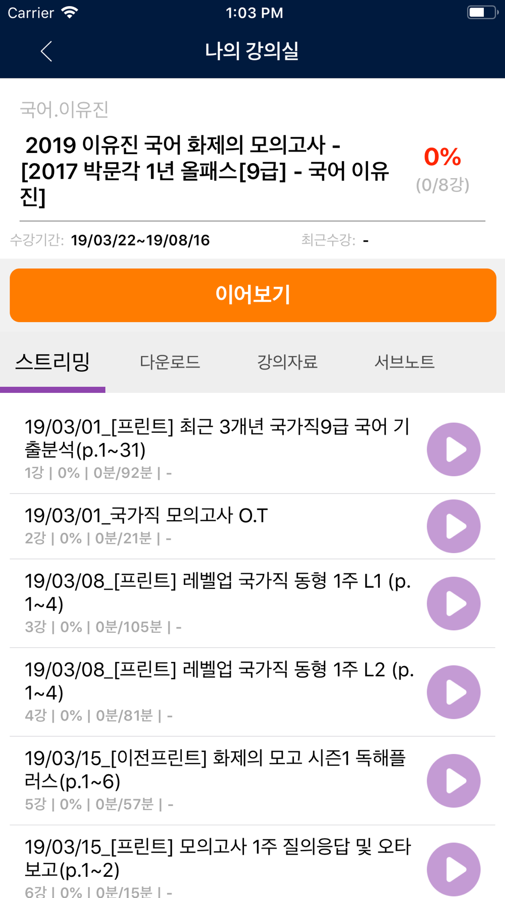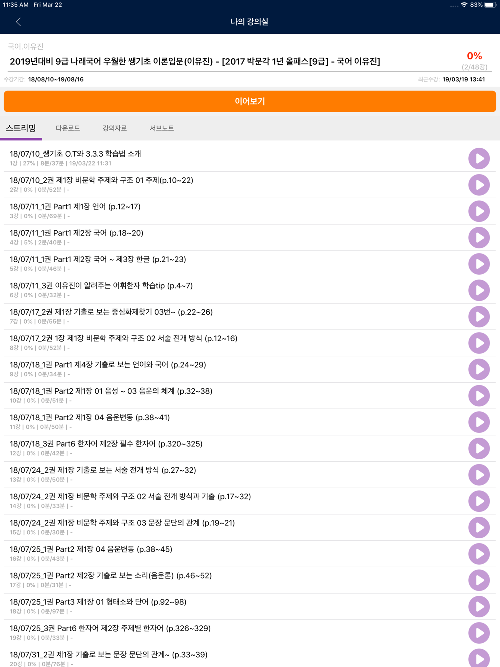 - ‘이어보기’ 마지막 수강했던 강의의 마지막 수강 시점부터 재생됩니다.