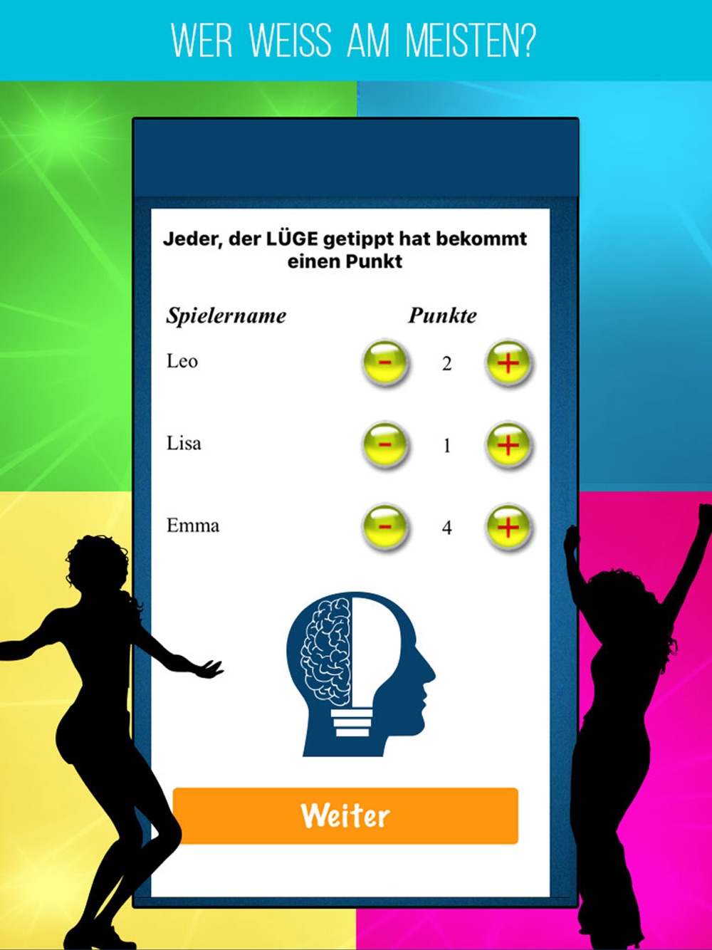 Wähle „Neues Spiel“, und gib dann die Anzahl der Mitspieler sowie deren Namen ein. Entscheide dich anschließend, ob du 5, 10, 15 oder 20 Spielrunden spielen möchtest.