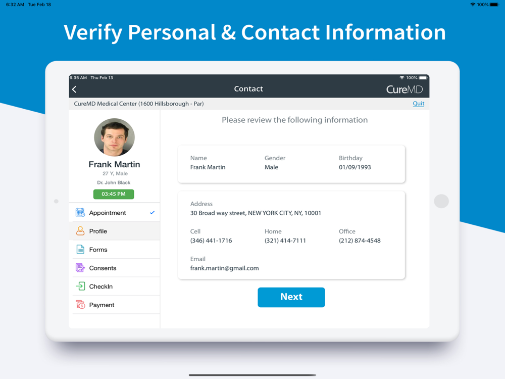 The app allows you to use the iPad both as a kiosk or be handed around the waiting area. This frees your front desk staff from worrying about registering new patients or allowing established patients to check-in for appointments. Another great feature is that while checking in, patients may update profile, contact and insurance details, and view and sign consent forms in just a few taps! And what’s more? The CureMD Kiosk allows patients to manage Co-pay and balance payments! Optimizing your workflow even further, patient information gathered on the app synchronizes with CureMD’s application in real-time, so the changes can be seen by your front desk straight away!