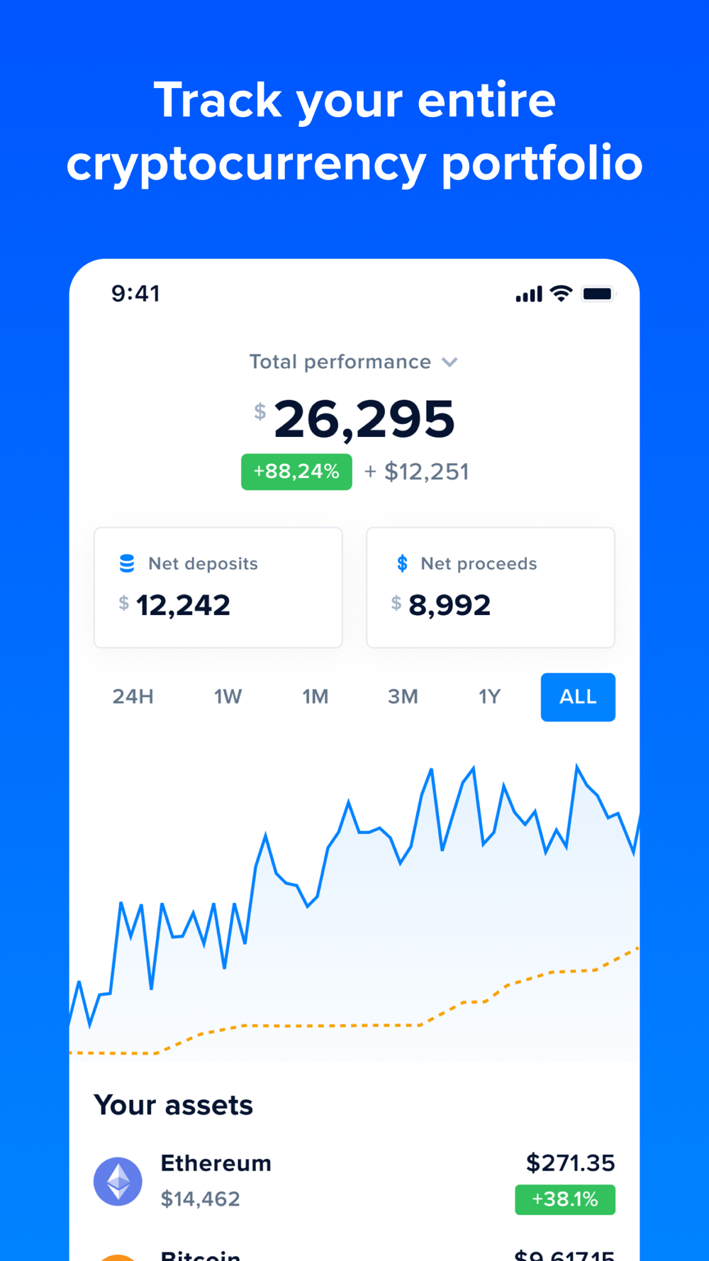 Get a clear picture of your crypto investments, including the current portfolio, your return on investment over time, and more.