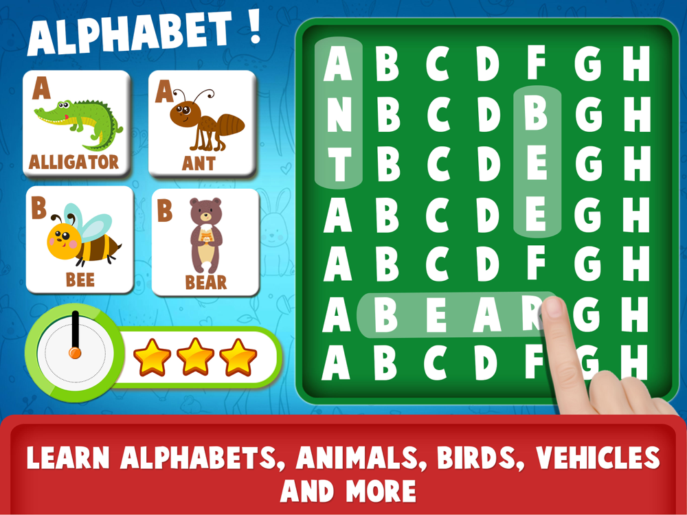Word Search is one of the wonderful educational word games that teaches kids how to remember new vocabulary and English words. With our educational games for kids your toddlers will learn and enjoy. Good luck and Have Fun Kids!
