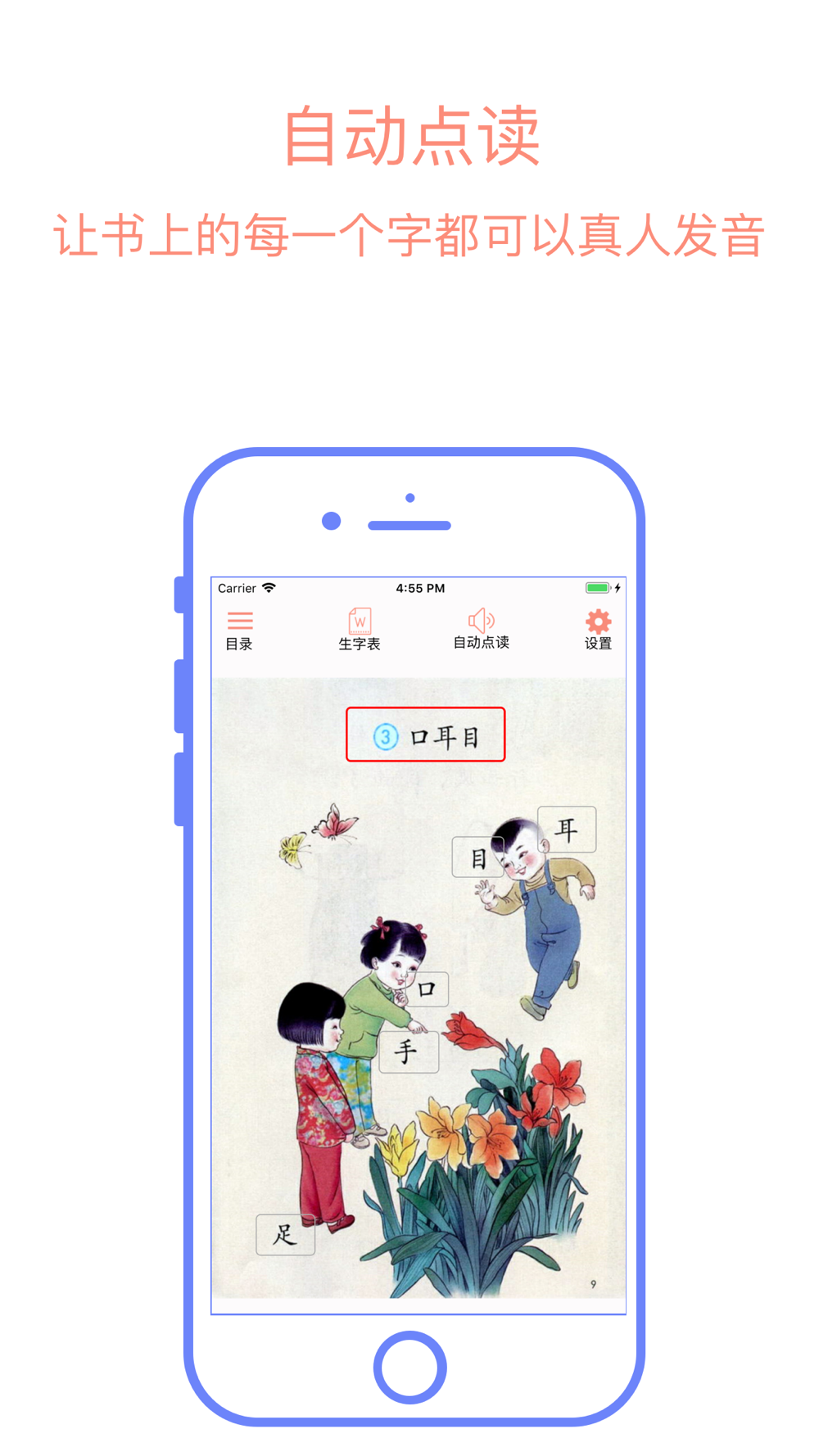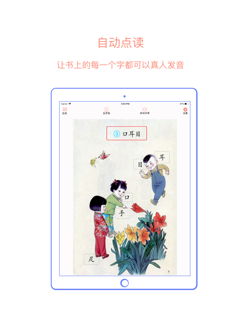 【2】课本每一页中字、词、句都可以点击真人发音,让孩子听得更清楚,学的更准确。