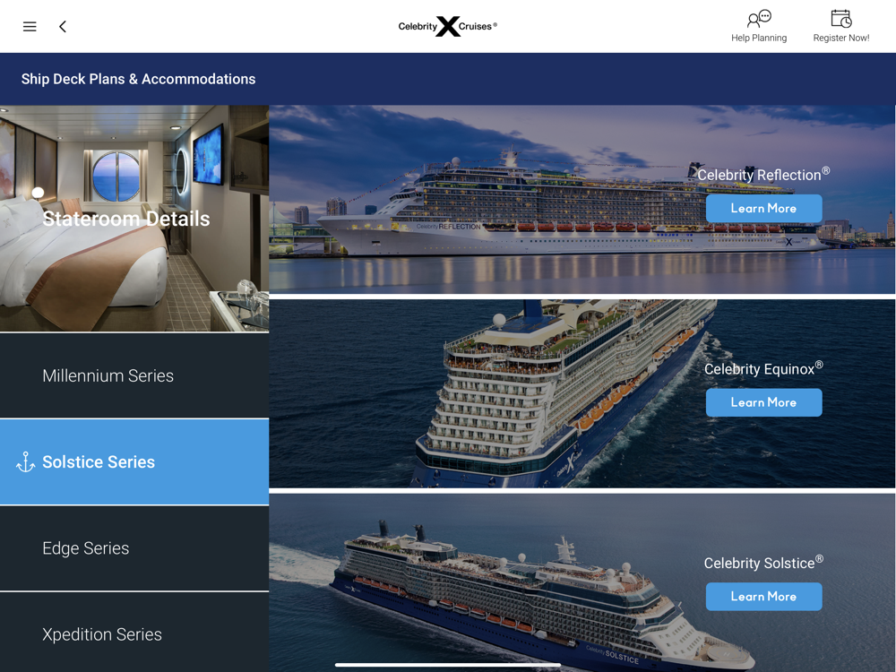 The Celebrity Cruises Brochure App has everything you need to pick and plan the perfect cruise vacation. Discover our current itineraries, dive into the Celebrity Cruises fleet and see our amazing staterooms, or learn about the incredible restaurants and entertainment offerings onboard.