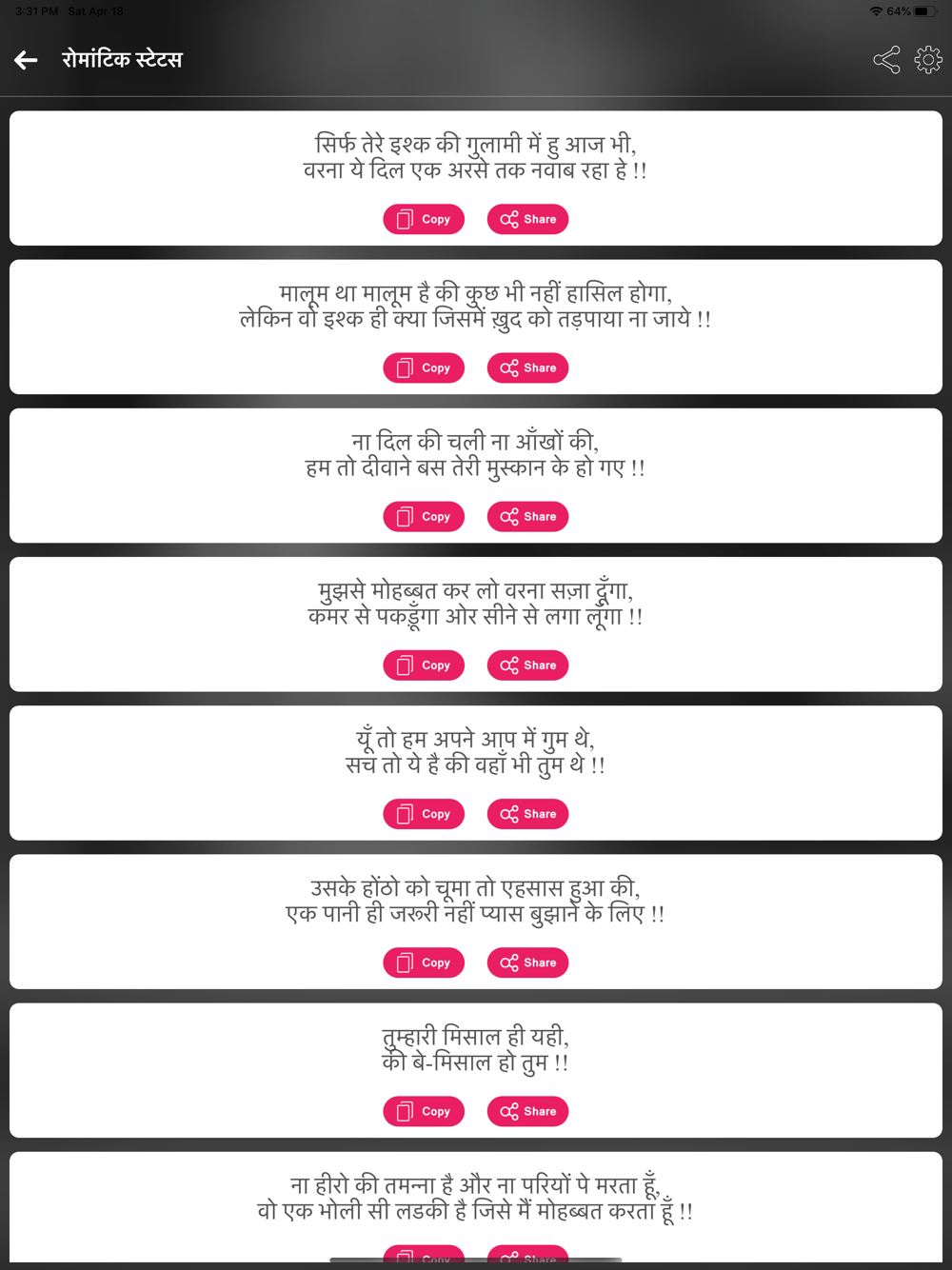 Hindi Status is One of the Best Application for Everyone Who just loves to set Best New Hindi Status, Hindi Quotes or Hindi Shayri on Facebook Timeline or Whatsapp Status or Twitter or even on Instagram.