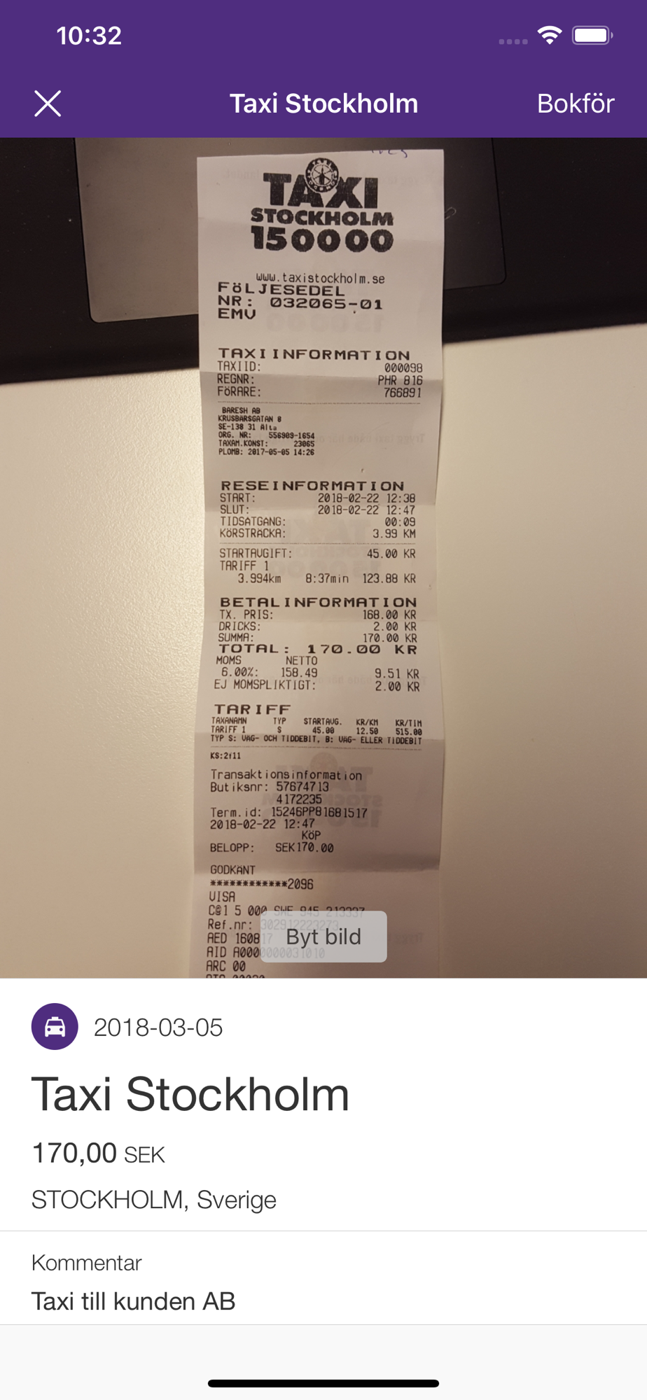 Du fotograferar och bokför ett papperskvitto direkt i appen och digitala kvitton kan enkelt vidarebefordras till appens kvittolåda. Efter att man angivit belopp, datum och kommentar kopplas kvittot senare till en unik korttransaktion från ansluten bank. Vi hanterar företagskort från Danske Bank, Eurocard, First Card, Handelsbanken, Nordea, SEB, Swedbank och Sparbankerna.