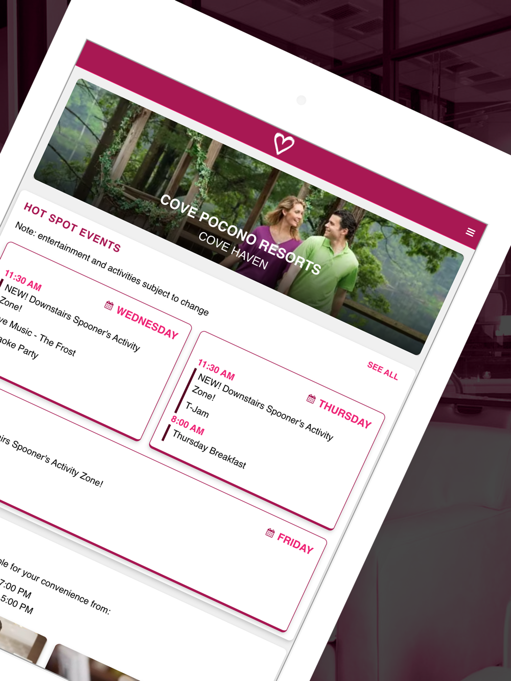 Year-round, guests can also enjoy tanning beds, billiards, swimming, racquetball, tennis, basketball, video game arcades and more. Plus the Pocono Palace Outdoor Adventure Zone and Cove Haven’s new Outdoor Game Zone offer extra activities (like backyard favorites!) for guests to play during their stay in the Land of Love.