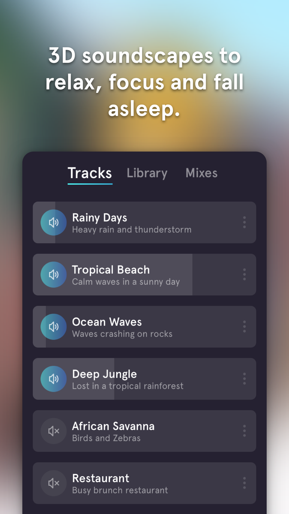 3D ambient soundscapes to relax, focus and fall asleep. Captured using special binaural microphones to give you an immersive experience.