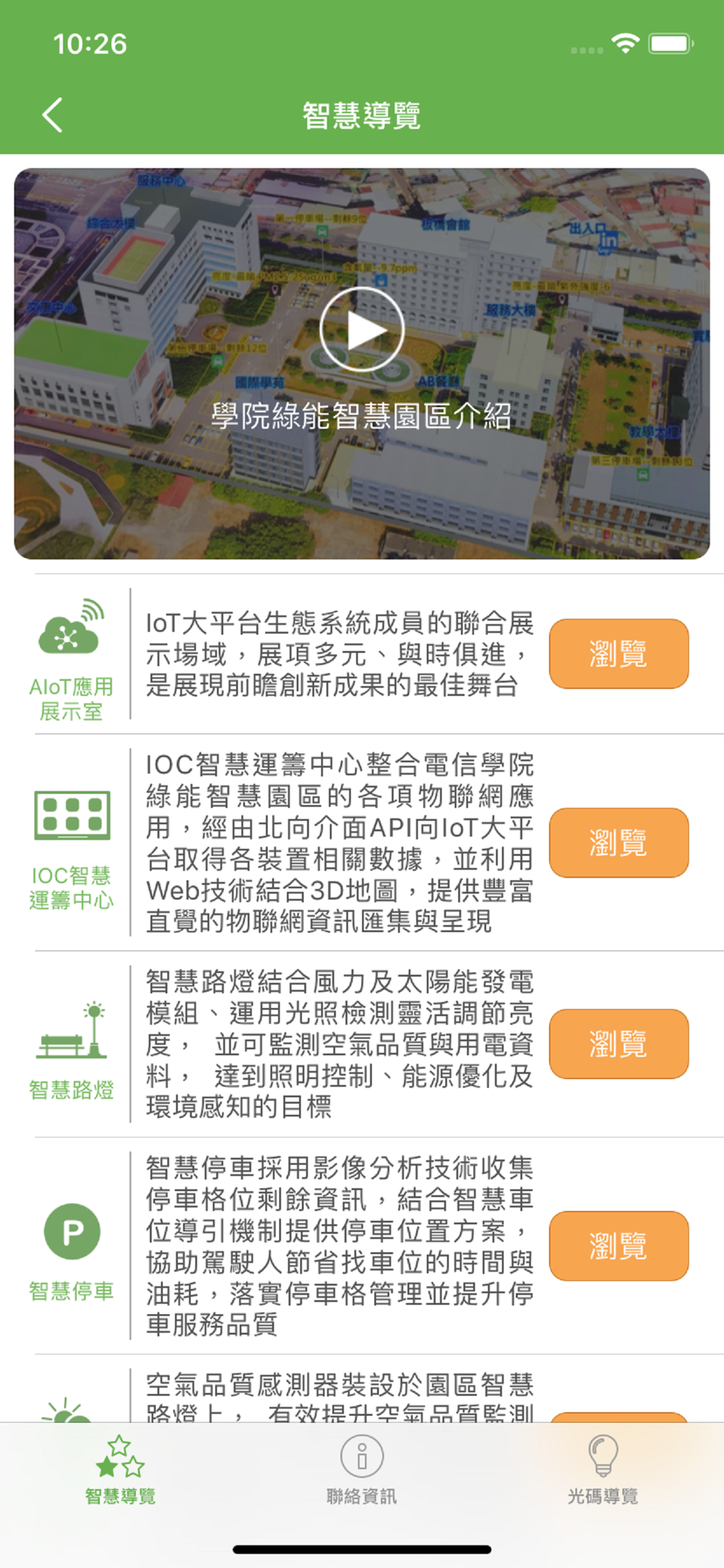 提供學員、訪客,透過此應用程式了解本院綠能智慧園區相關應用之資訊,提供環境資訊、智慧導覽、停車資訊、智慧學習、智慧閱讀、生活資訊、活動集點等功能使用。