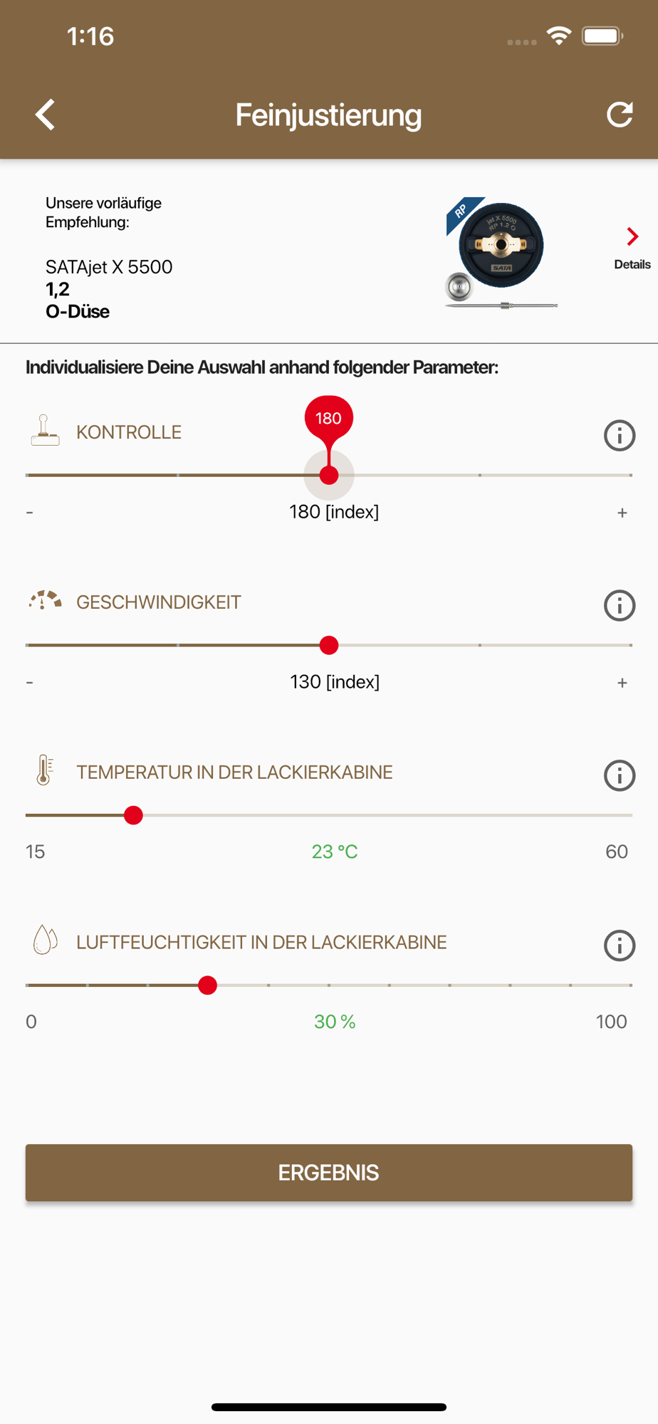 The assistant, with its clearly arranged design, asks you simple questions and then intelligently and quickly selects the X-nozzle that best matches your requirements. Based on your spray gun type, the varnishing material used or the desired coating thickness, it only takes a few clicks to arrive at a suitable nozzle recommendation that you can then adjust to your personal preferences and circumstances. You can individually adjust your requirements regarding varnishing speed and control as well as the temperature and humidity in the spray booth.