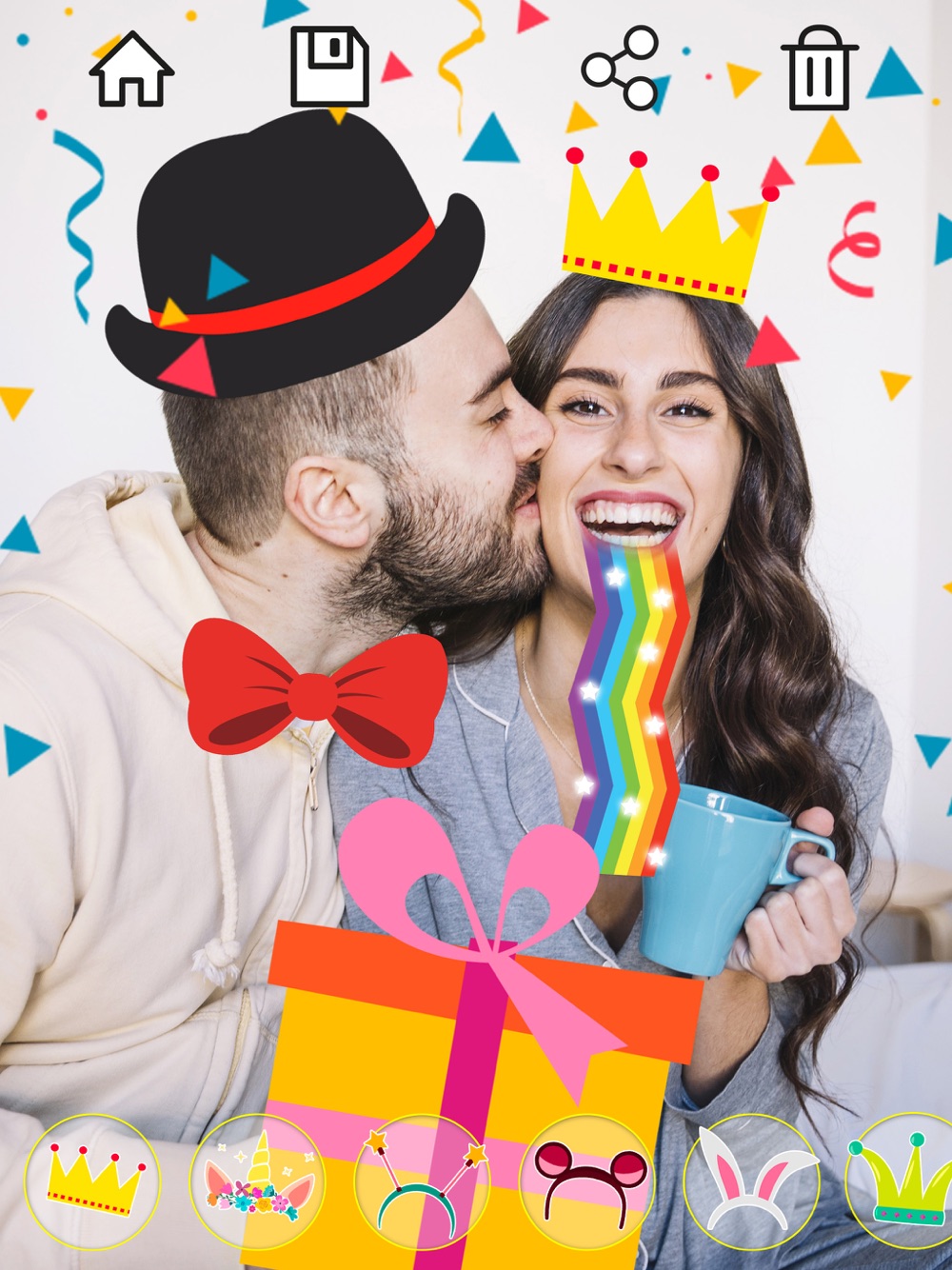 "Choose a photo from your gallery or take a new one and enjoy our selection of latest popular happy birthday stickers such as rainbow puke, confetti, hats, moustache, bow tie, glasses, colorful wigs, happy birthday messages and more. Use our photo editor tool to create fun photo montages and share them on your birthday.