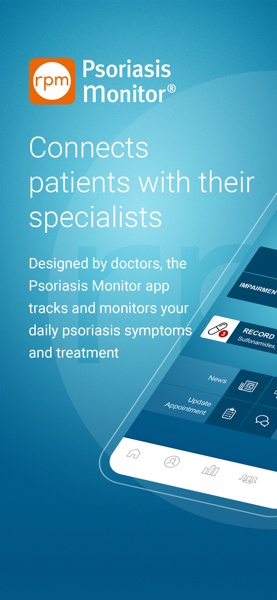 Psoriasis Monitor is designed by doctors in concert with RPM Healthcare’s founders' decades of patient education expertise. This is the first Psoriasis monitoring app that will allow you to connect to your doctor. Psoriasis Monitor provides users with a clean interface and enhanced reporting, which simplifies tracking your skin condition. More than just an intuitive tool for tracking your flare-ups, their severity, duration, and triggers, Psoriasis Monitor allows you to access your doctor's support (or our Psoriasis Navigator) and allows your doctor to follow your progress between visits. Easy-to-read reports can be shared with others, like family, friends, or your doctor.