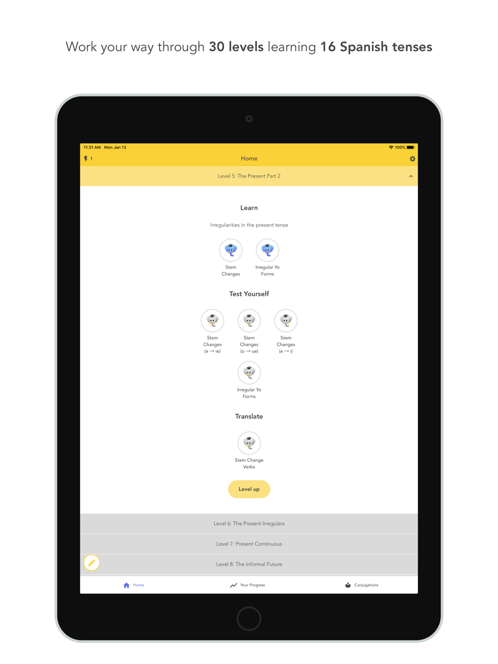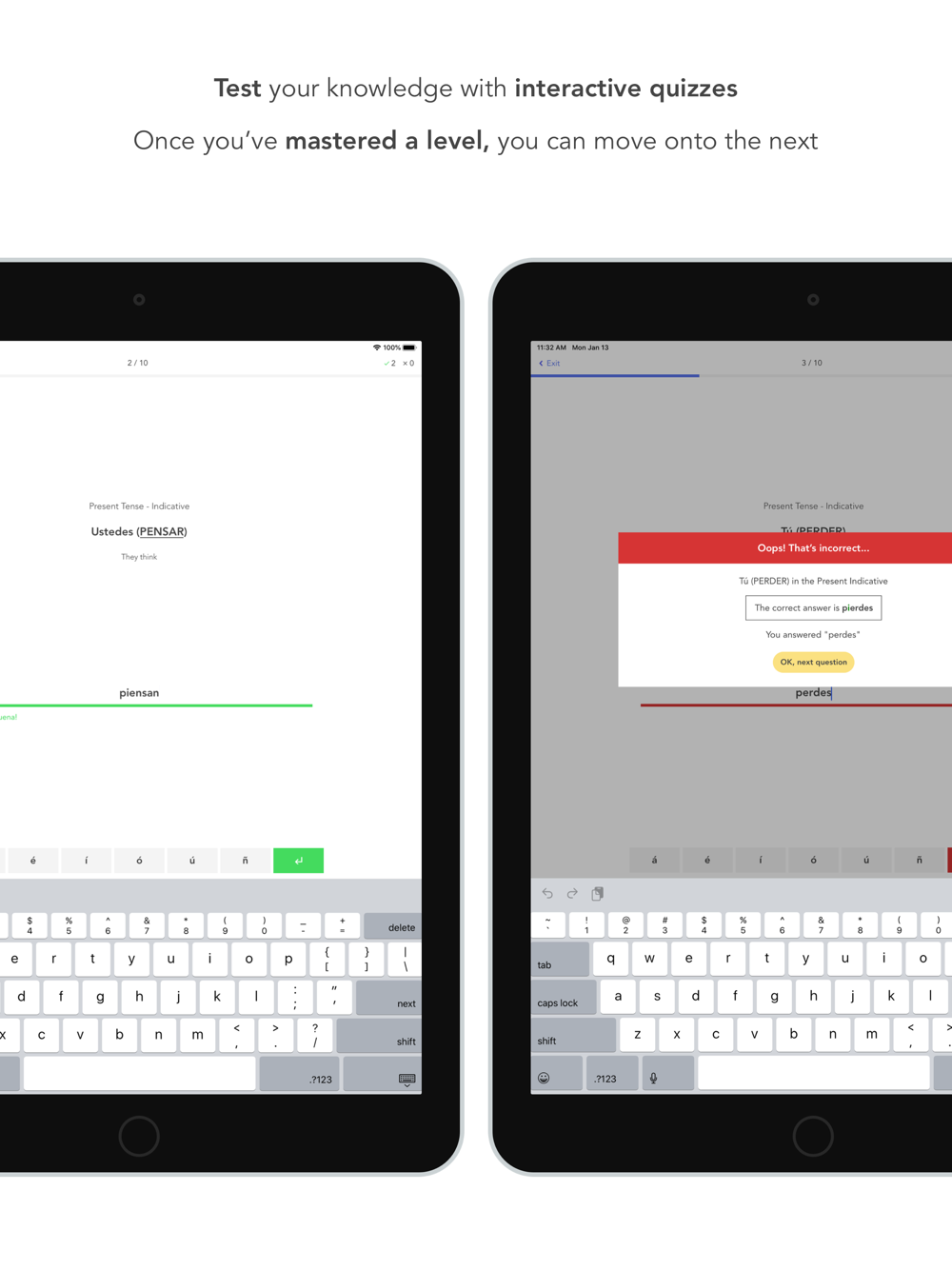 - 30 levels (6 for free) with bite-sized lessons and quizzes guiding you through 16 tenses.