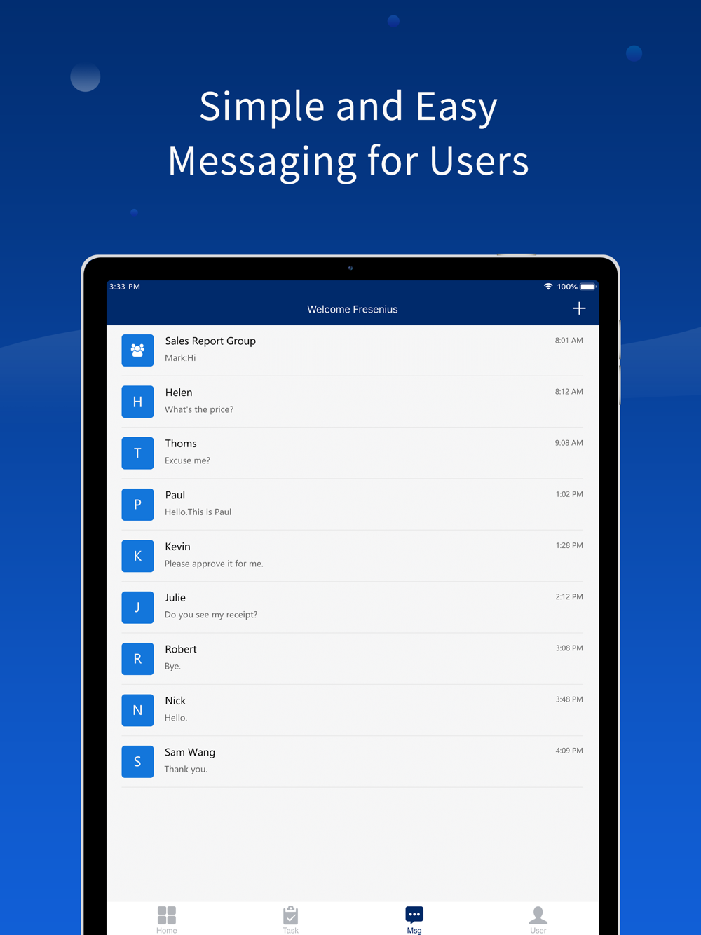 Fresenius App is unified mobile solution, which provides customized services for different users, so that they can receive enterprise information and product updates any time. The application also includes real-time chat function, so that users can communicate each other without location boundary. The user-friendly design and tailor-made functional modules optimize and automate operation for users.