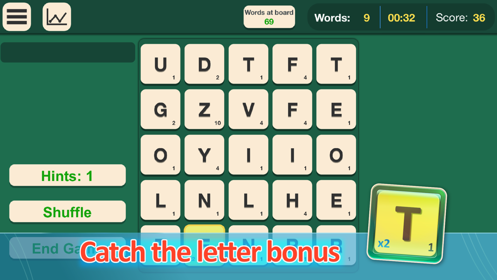 Drag over the letters to create words. Valid words will increase your score and dwindling timer. Those letters will be changed with new ones falling from above.